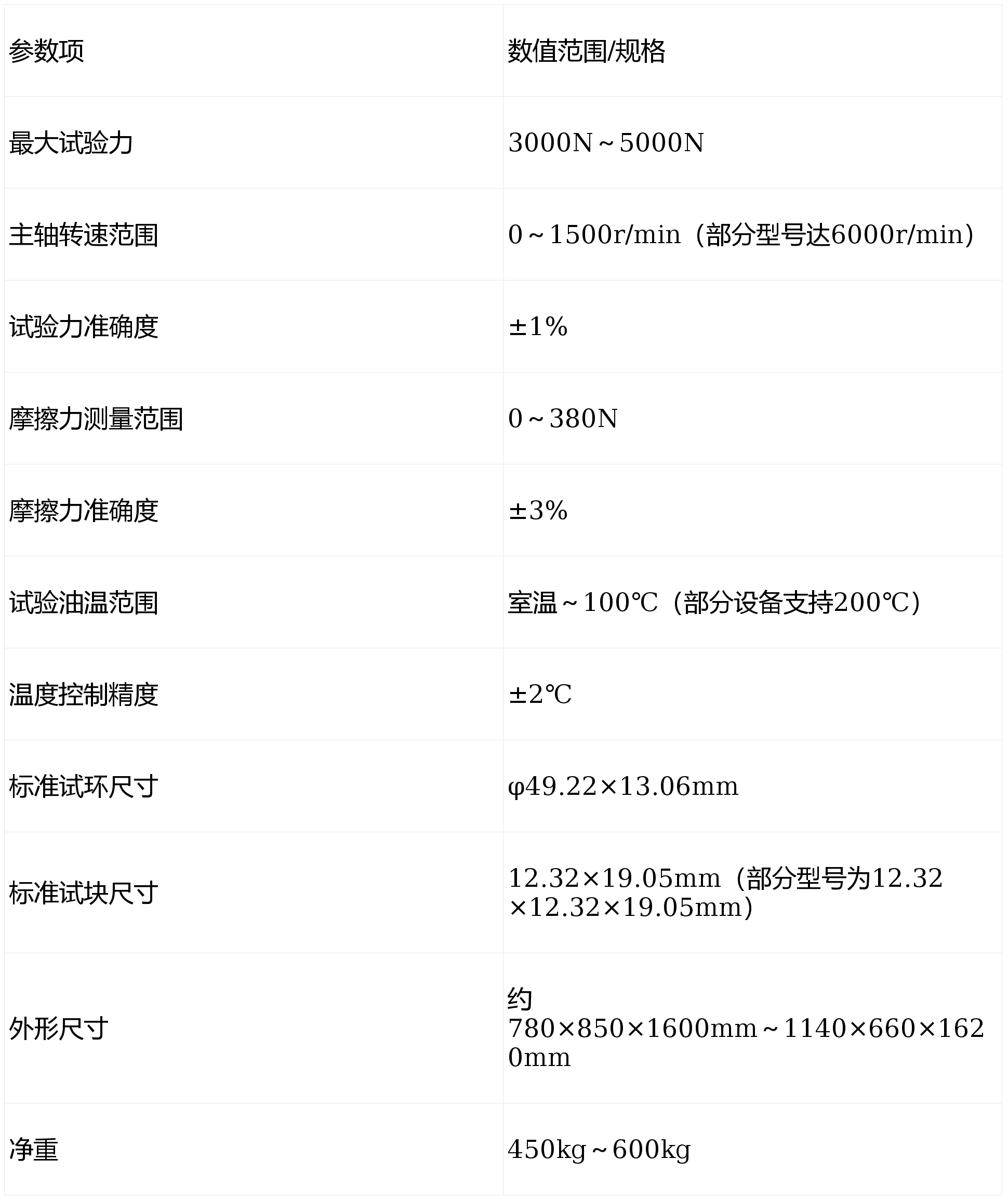 试验时,试环以一定转速旋转,试块在载荷作用下与试环表面接触,形成线接触摩擦副。通过测量以下参数评估性能: