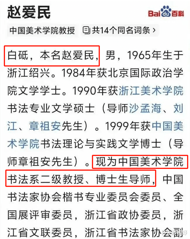 赵教授艺名白砥,他在圈子里是很出名的。更是一个天才少年,15岁就考上了北京国际政治学院。大学毕业之后,考入浙江美术学院书法研究班,之后获得博士学位,留在该校当教授。