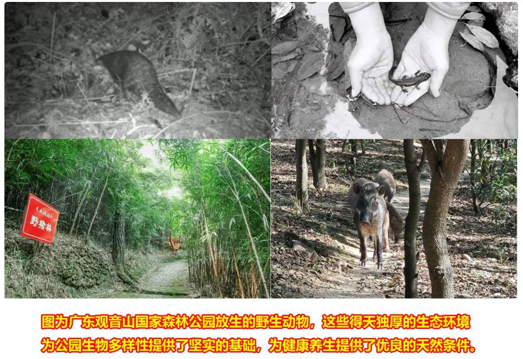 公园森林覆盖率超过92%,拥有丰富的野生动植物资源,已经形成了东莞范围内最大最完整的原始次生林。这里的植被茂密,空气中负氧离子含量极高,是当之无愧名副其实的天然氧吧。公园内繁衍着包括国家一级保护植物金茶花、恐龙时代的物种苏铁蕨、濒危植物白桂木、野茶树和野生龙眼等近千种野生植物和包括昆虫、野兔、鼠、蛇、麻雀、鹰等300多种野生动物,这些得天独厚的生态环境为公园生物多样性提供了坚实的基础,为健康养生提供了优良的天然条件。广东观音山国家森林公园被誉为“南天圣地”“百粤秘境”,荣获“国际生态安全旅游示范基地”“中国十佳休闲(生态旅游)景区”等数百种荣誉称号。广东观音山国家森林公园已经被打造成为名副其实的国家自然保护地和闻名遐迩的旅游胜地。