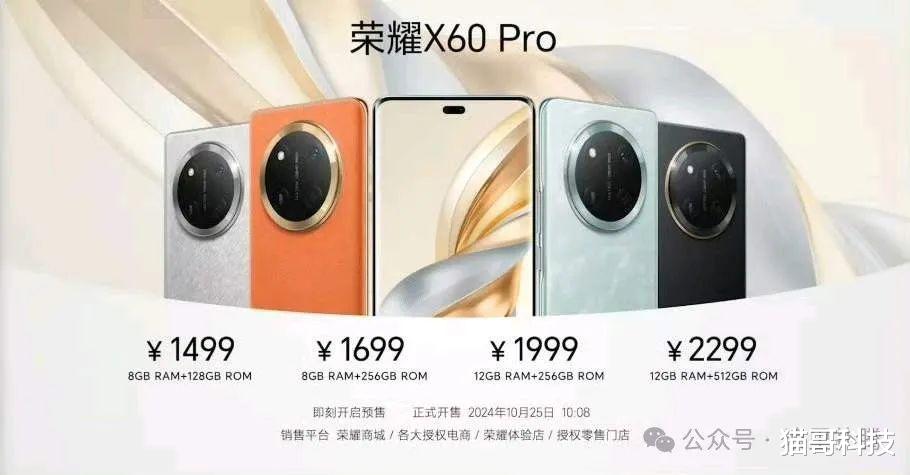 荣耀X60 Pro共4个版本8GB+128GB 1499元;8GB+256GB 1699元;12GB+256GB 1999元;12+512GB 2299元。