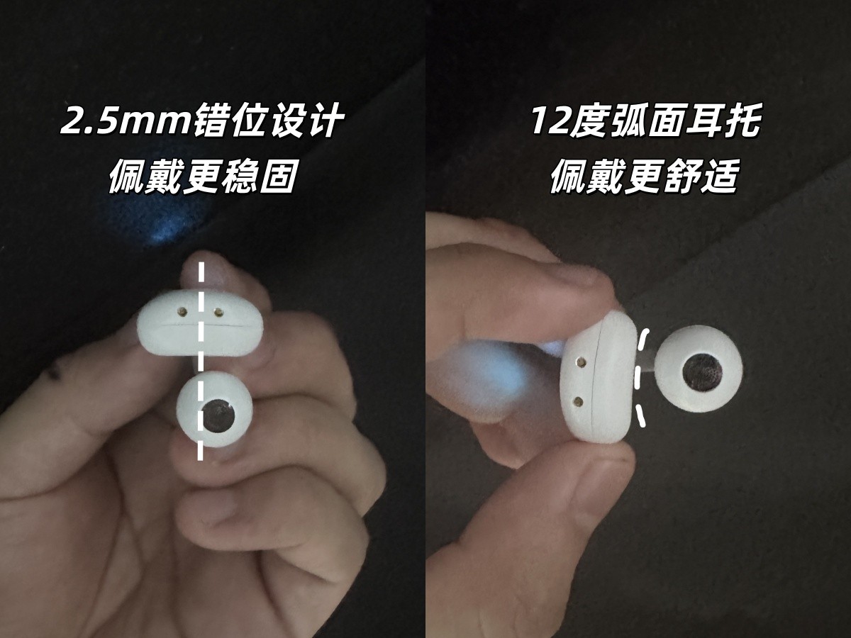 佩戴方面:这款耳机戴在耳朵上几乎没什么存在感。耳机采用前高后低的2.5mm错位设计,能恰好贴合耳朵形状,让佩戴更稳固;电池部分做成12°弧面耳托,完美贴合耳背,进一步提升了贴合度与舒适度,戴再久也不会有夹耳朵的感觉,而且单耳仅重4.5g。