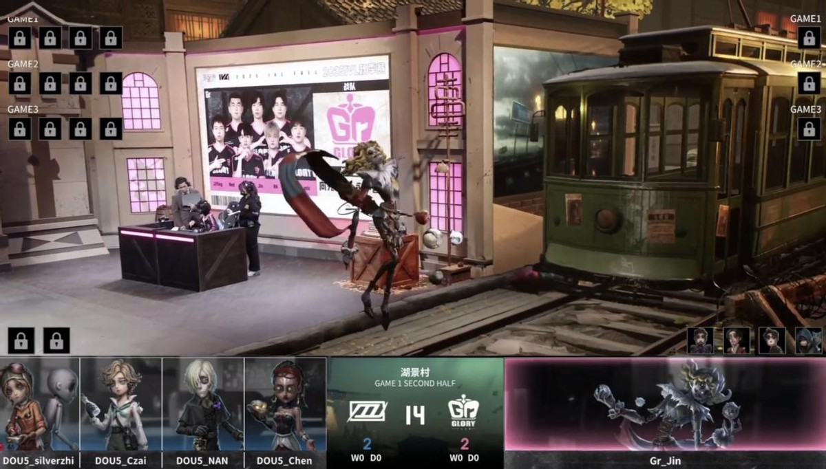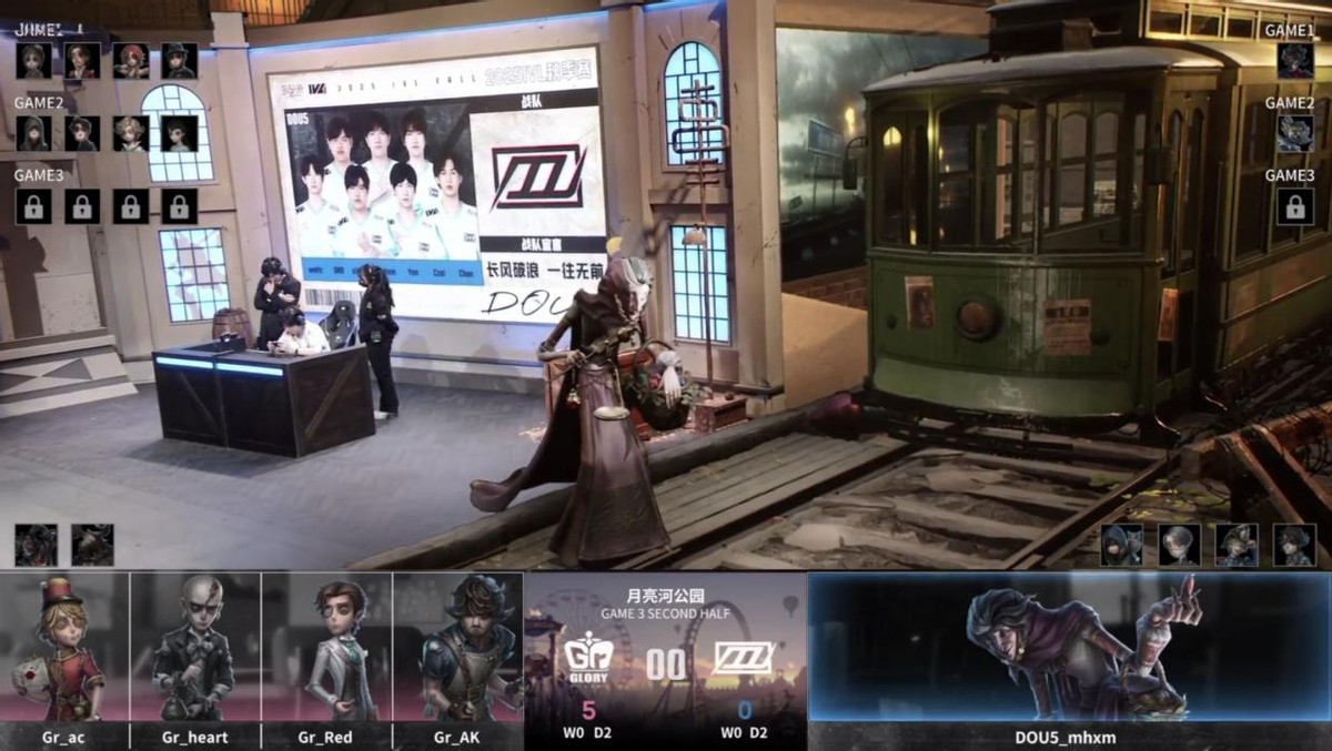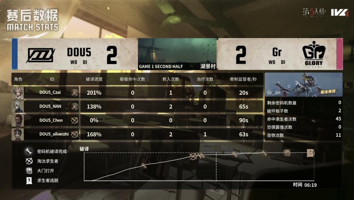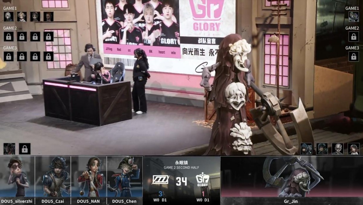 DOU5的求生者选择了入殓师、哭泣小丑、佣兵、病患(BAN歌剧演员、“跛脚羊”);Gr的监管者Jin选择了鹿头。(BAN先知、前锋、古董商、小说家)