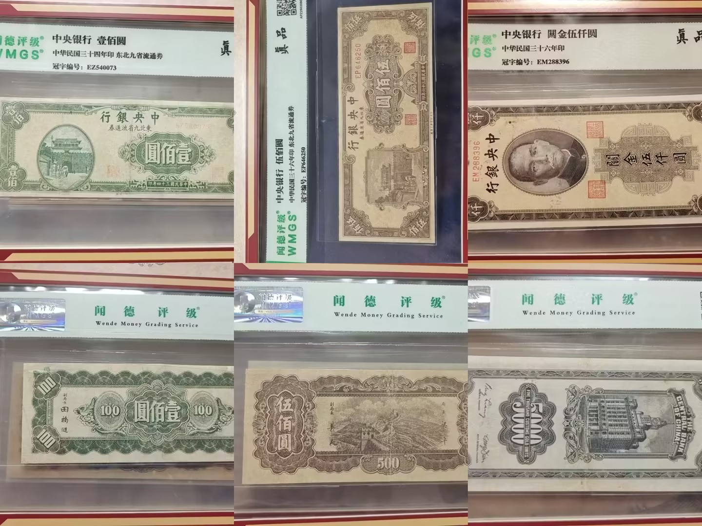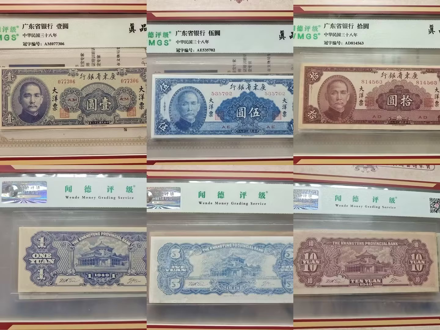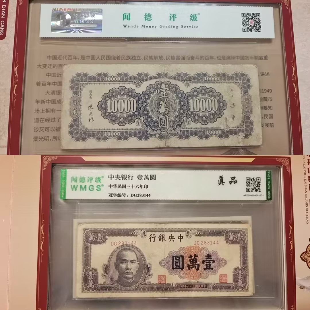 品相与评级:所有纸币均经过闻德评级(WMGS)封装,评级等级为“真品”,冠字编号清晰可查。专业评级确保了真伪,量化了收藏价值。