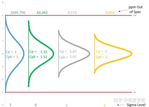 首先,我们必须清楚Cpk 1.33在视觉上意味着什么:它意味着你的流程分布(±3西格玛)与规格上限(USL)和规格下限(LSL)之间,只有1个标准差的“缓冲空间”。