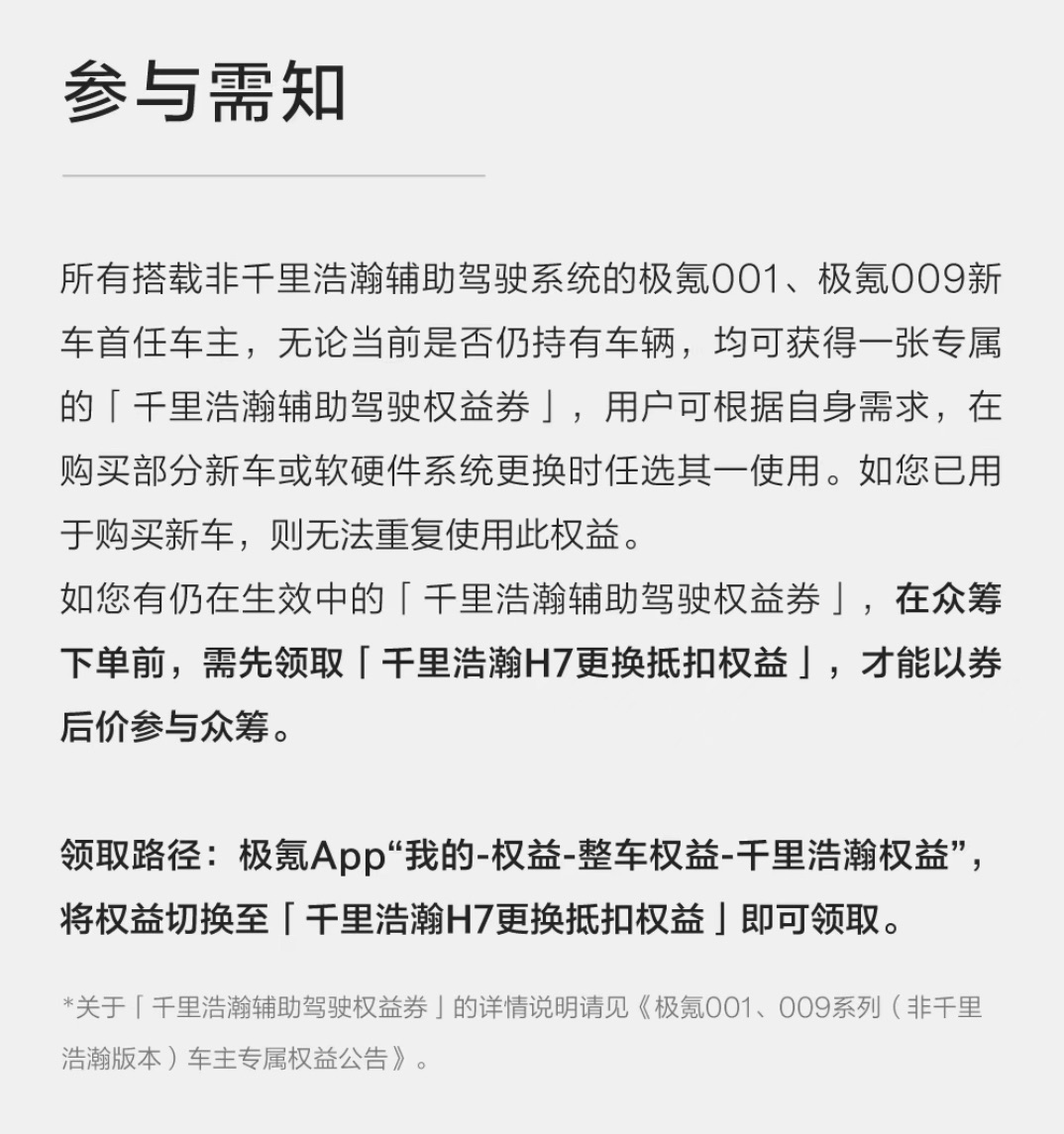 非千里浩瀚辅助驾驶系统的极氪001、极氪009新车首任车主都有专属的权益券,可以抵扣众筹升级费用和换购的尾款,即便不参与众筹,后悔了也可以用直接用权益券去抵扣购搭载千里浩瀚智驾的新车尾款,到2030年前都有效。这样来看的话,反正早晚都可以升级智驾,但一个是改车,一个是换车,选谁答案很明显吧。