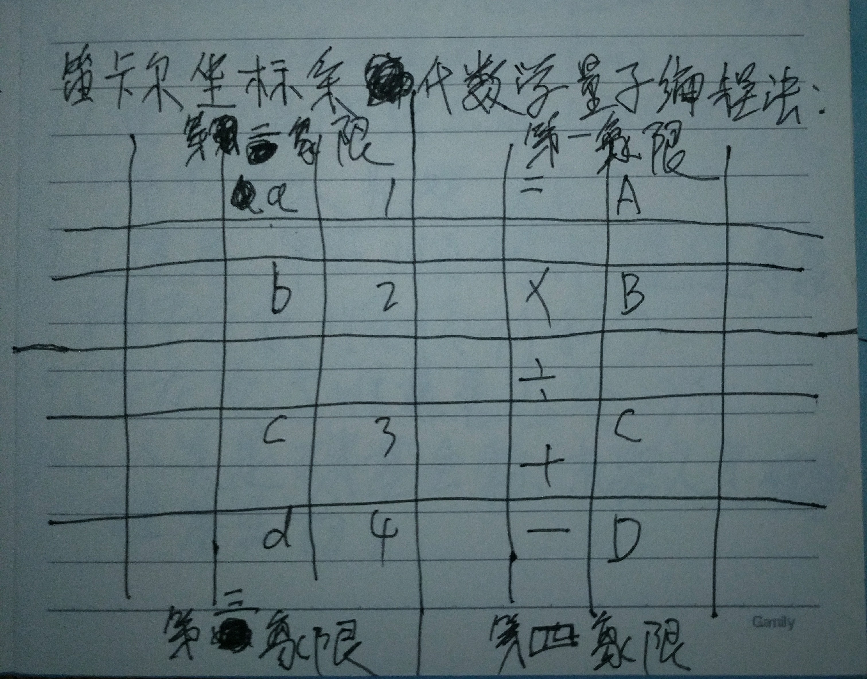 代数学编程方面采用的是成正比、反正比、增加、减少、等于(目的)的数学方法编程,数学应用于万物,尤其是数学方程式,笛卡尔坐标系编程法是采用笛卡尔本人发明的代数解析几何的直角坐标系,分第一象限、第二象限、第三象限、第四象限,这个笛卡尔坐标系可以应用量子随机行走的量子钟当中的可编程二维量子行走。