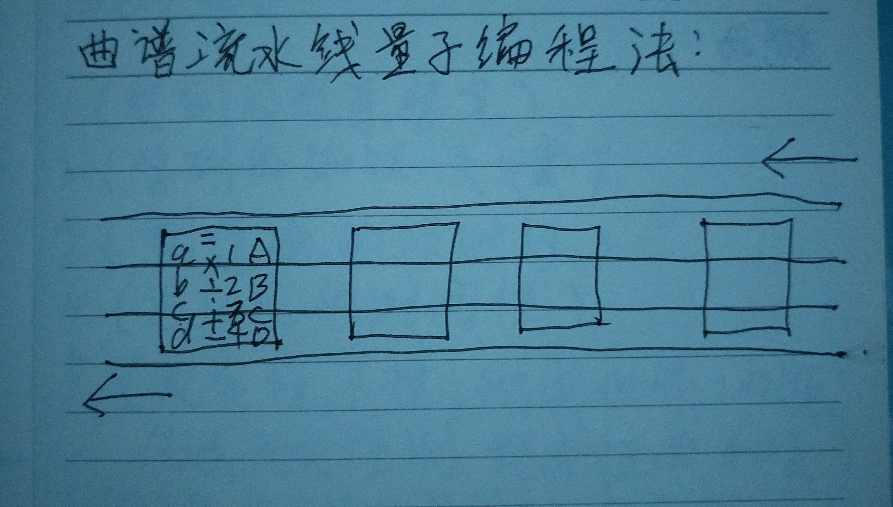 量子时间晶体编程法是具有流动时间性的一个曲谱编程,比较传统的电子计算机代码编程是流动的,也是一个流动曲谱编程,具有时间性,曲谱流水线量子编程法是采用像音乐曲谱一样的一种模式,也是可以流动的音乐曲谱编程。