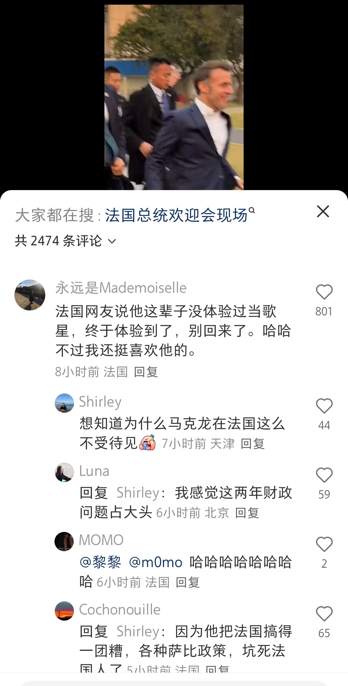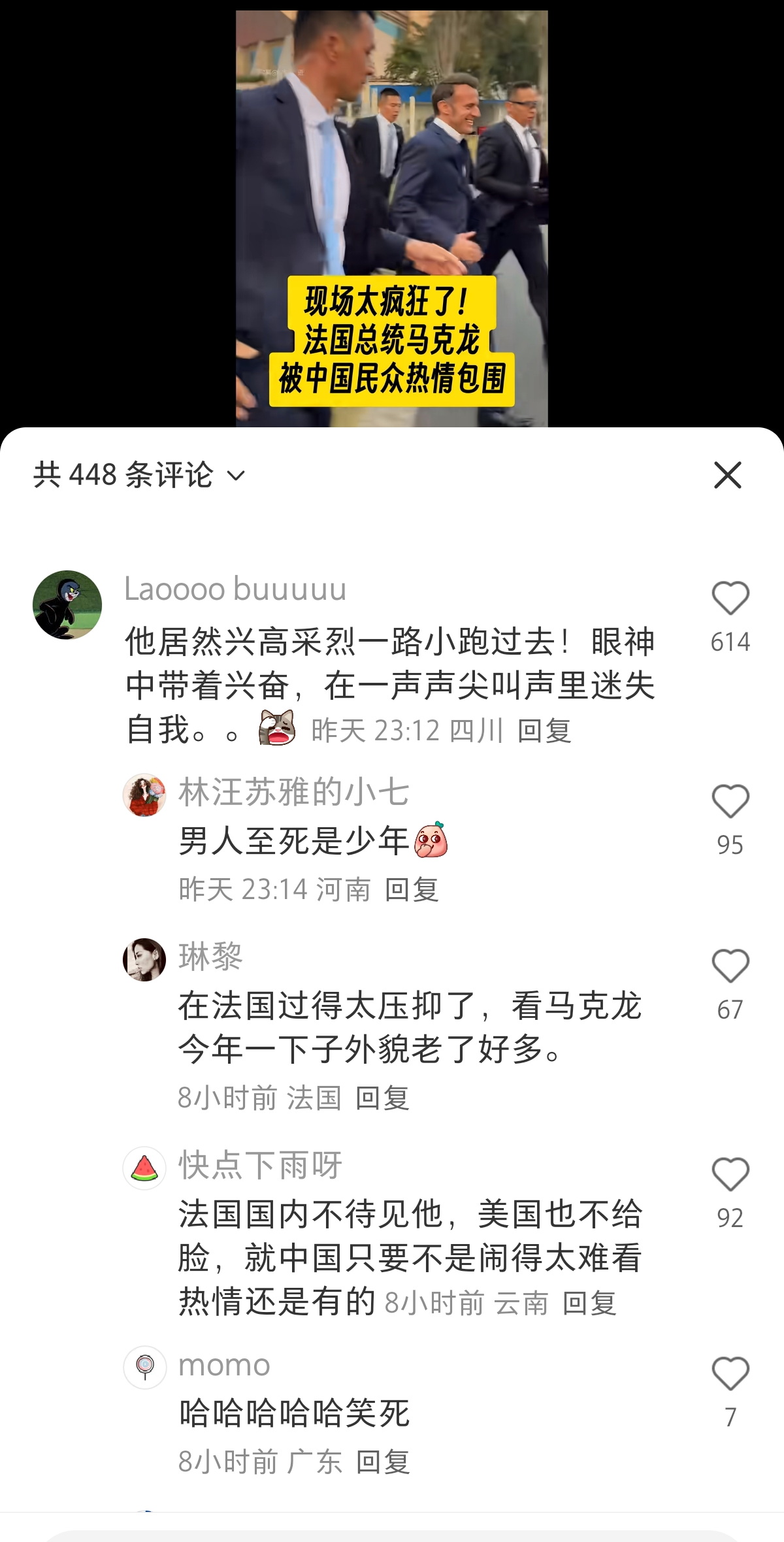 更有网友将马克龙在中国的受欢迎程度与在法国的情况进行对比:“这里应该没有人朝他扔鸡蛋。”