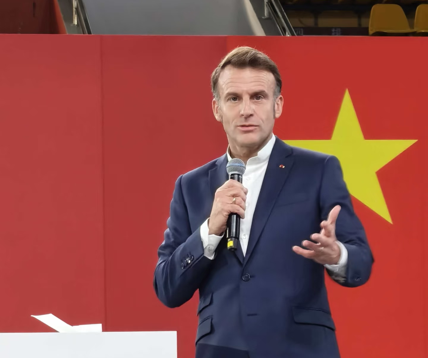 当他下车走向体育馆时,周围早已聚集了数百名兴奋的学生。与平时严肃的政治场合截然不同,马克龙显得格外放松愉快。