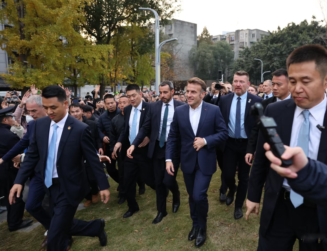 金黄的银杏树下,法国总统像个兴奋的少年,一路小跑冲进人群,