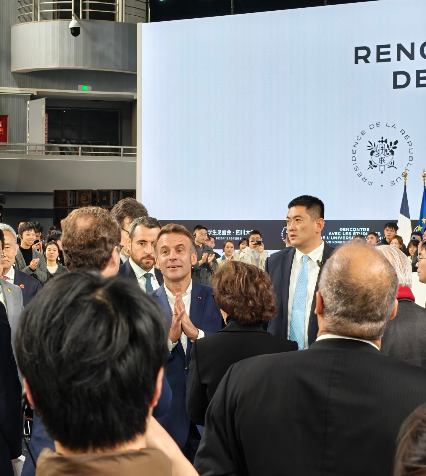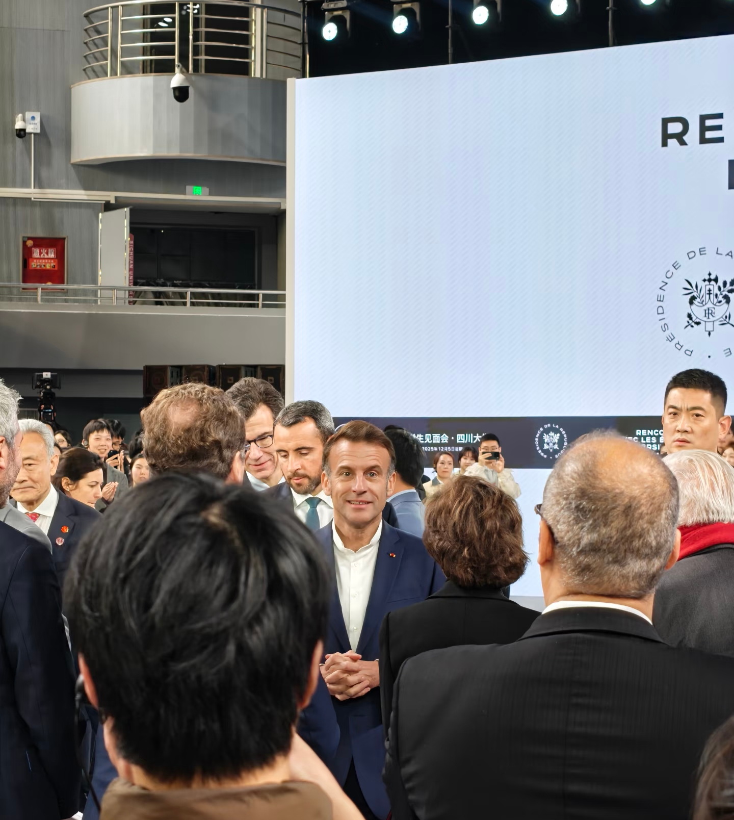 12月5日下午,法国总统马克龙站在四川大学望江校区体育馆广场上,被几百名热情的学生团团围住。