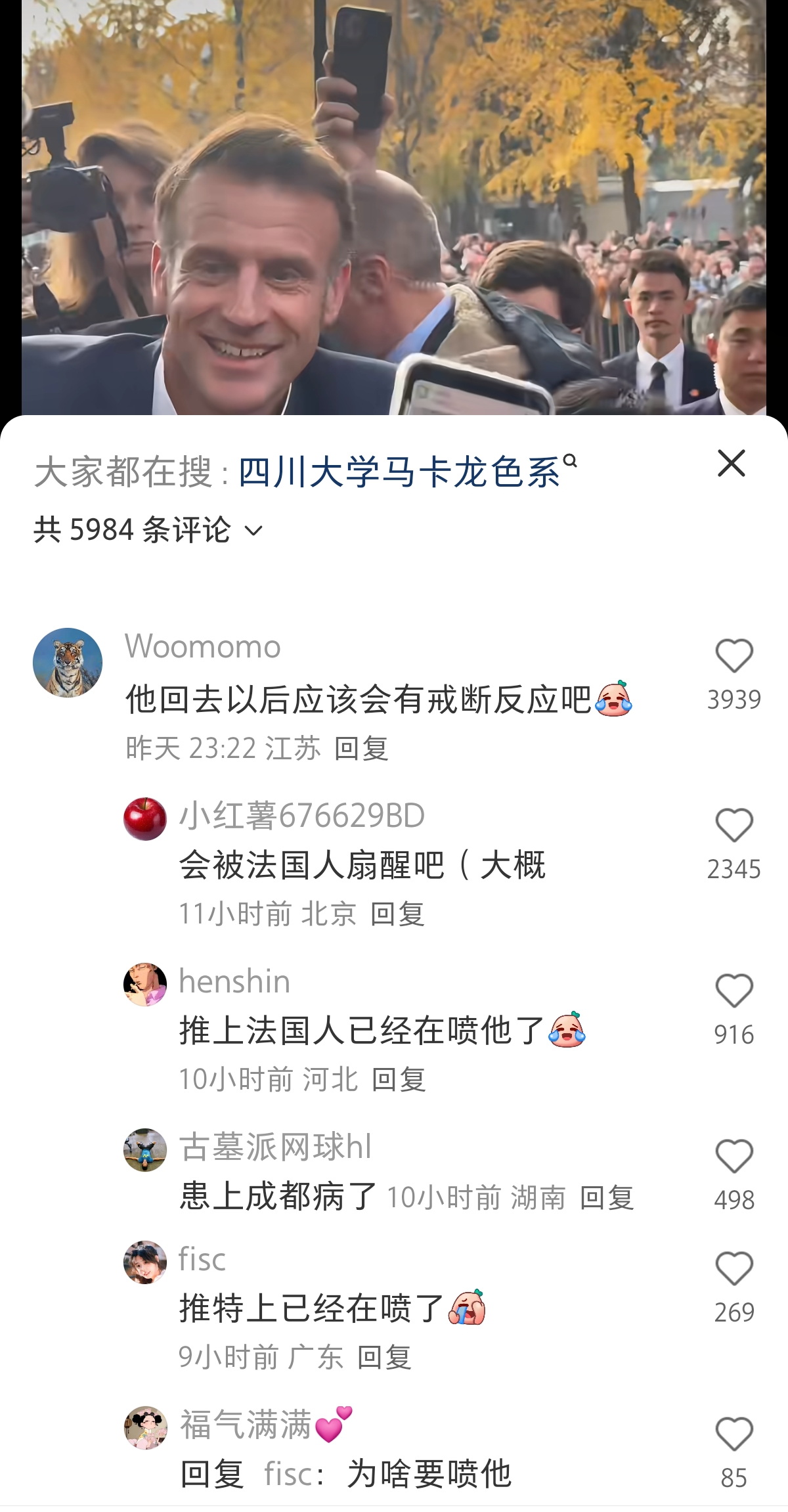 “我感觉马克龙很享受这种在大学里头被学生热情打招呼的感觉。”一位网友回忆道,“上次在中山大学也是。”