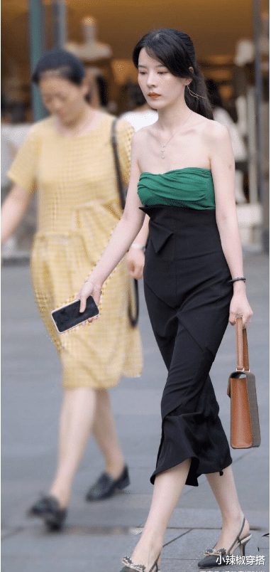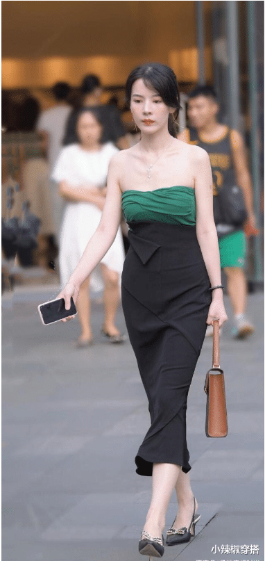 草绿色抹胸连衣裙搭配尖头高跟鞋,实在是太减龄贵气。这位美女穿着一件拼色的抹胸连衣裙,这种黑绿拼接的单品真的非常显气质。美女迷人的锁骨和颈项一览无余,而且皮肤还非常白,走在路上更是吸睛亮眼。