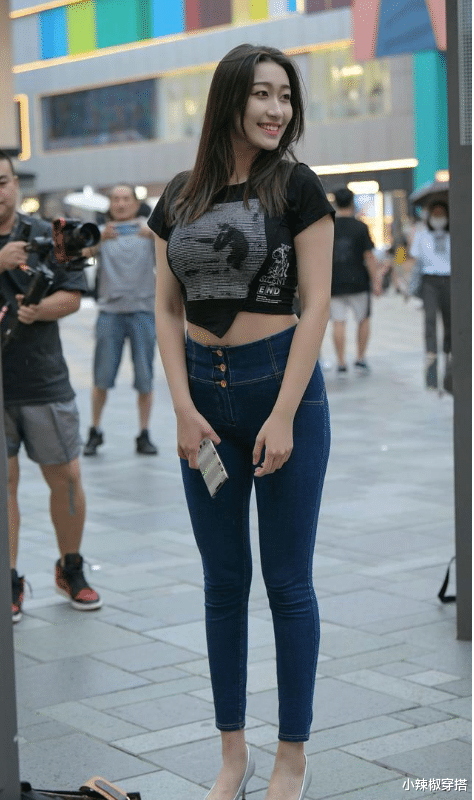 深蓝色牛仔裤是一年四季都适合穿的单品,经久不衰,时尚又百搭。美女的身材非常饱满,一条深色紧身牛仔裤让美女看起来更瘦。美女的身材有料,露腰的黑色t恤超级性感。