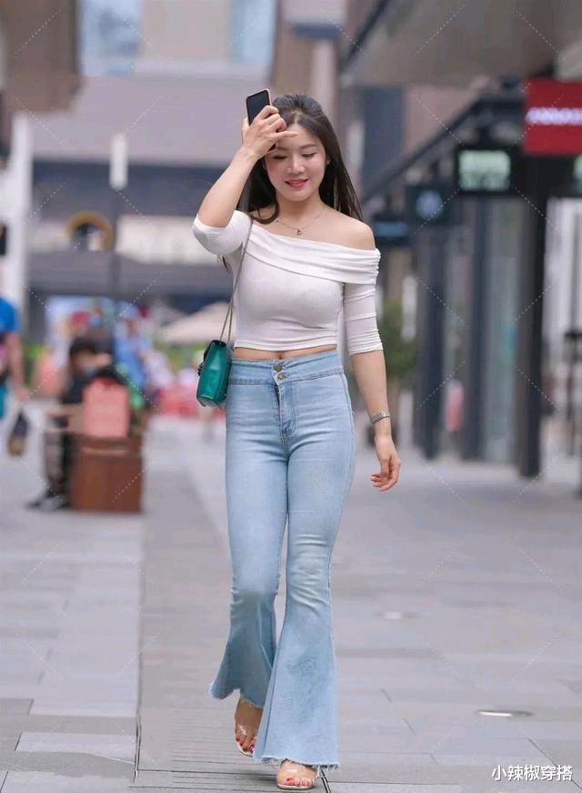 高腰微喇牛仔裤让美女看起来更加的高挑挺拔,微喇设计还是非常能遮肉的,显得更加纤细。上衣的一字肩设计比起那些普通的t恤,会显得更加大气有美感。搭配上一双高跟凉鞋,更加拉升腿部线条,充满着性感的魅力,也增加了不少十足的活力。