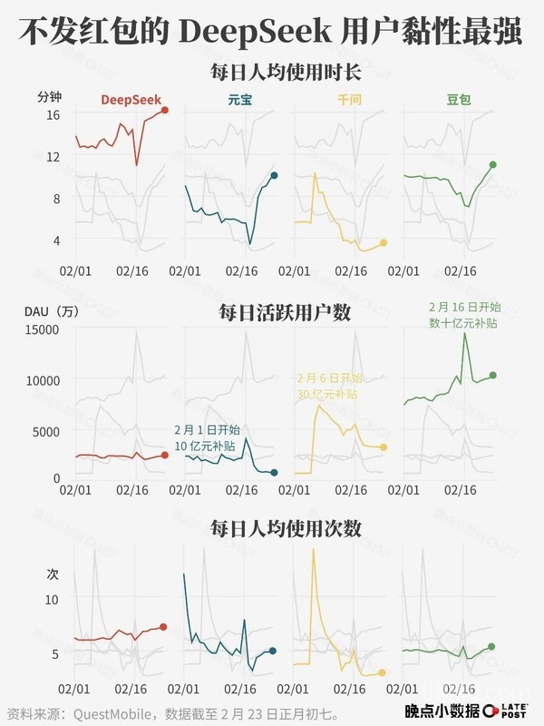 根据QuestMobile的数据,补贴高峰期,每天有1.4 亿人打开豆包,7300万人打开千问,4000万人打开元宝。元宝用户量比未开展红包活动的DeepSeek高出近一倍。不过补贴一停,效果回落明显。到2月23日,它们的日活迅速下滑:元宝几乎回到春节前水平;千问下跌幅度较小,因仍在持续补贴但力度有所缩减;豆包回落后维持在1亿左右。DeepSeek则保持稳定,日活数倍于元宝,接近千问。