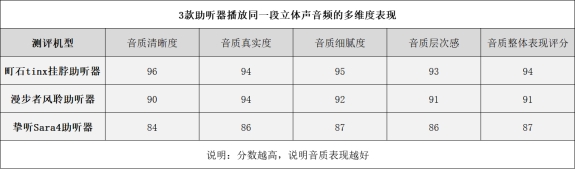 测评方法:本次测试,我播放了同一段立体声音频,重点关注三款助听器在音质清晰度、真实度、细腻度和层次感方面的表现,然后对维度进行评分。