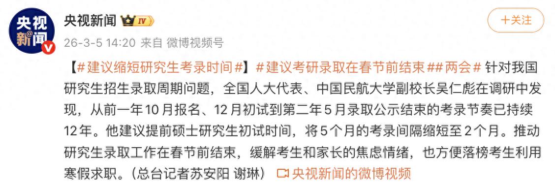 近日,大秦教育关注到有一则消息在考研圈炸了锅。两会期间,全国人大代表建议,将目前长达5个月的研究生考录周期压缩至2个月,力争在春节前完成全部录取工作,以缓解考生和家长的焦虑情绪,也方便落榜考生利用寒假求职。