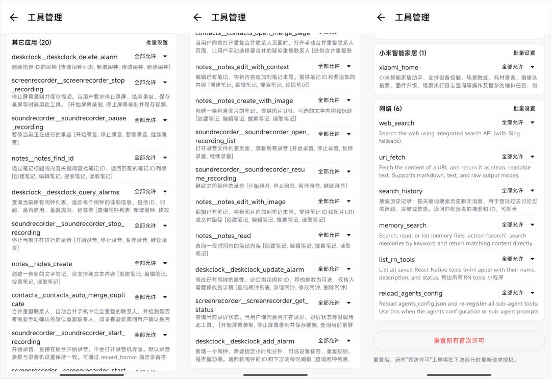 除了短信、笔记、应用、通许录等等,miclaw第一批,上线了不少系统级的工具,可以在设置的工具页面里面都看到。