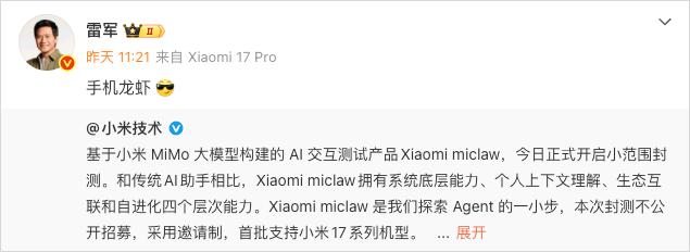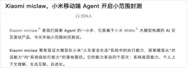 上周五,小米的Agent产品Xiaomi miclaw,正式官宣。