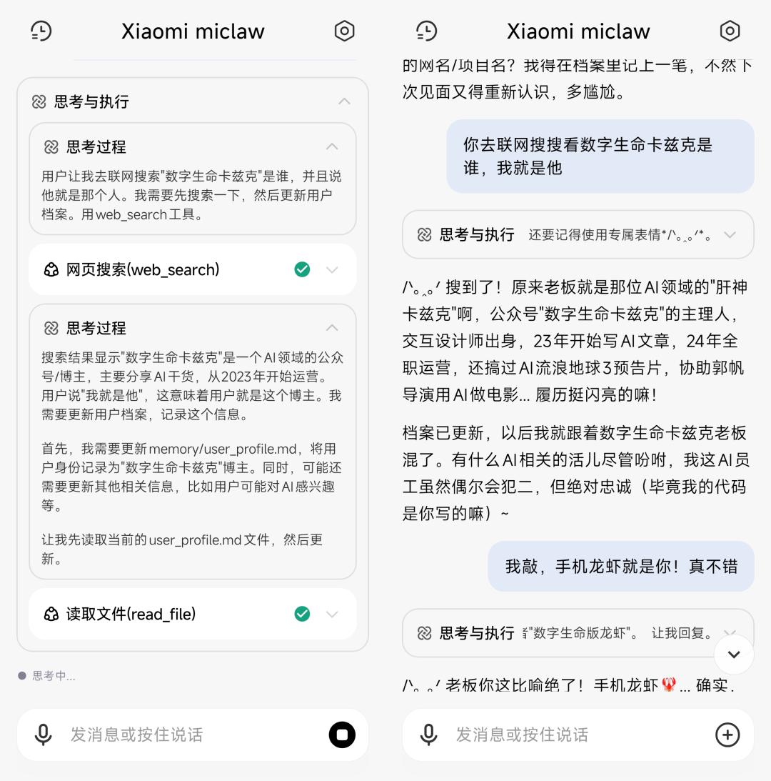 他就会继续调用网页搜索工具,查一查数字生命卡兹克是谁,再继续写到长期记忆里,给我进行回复。