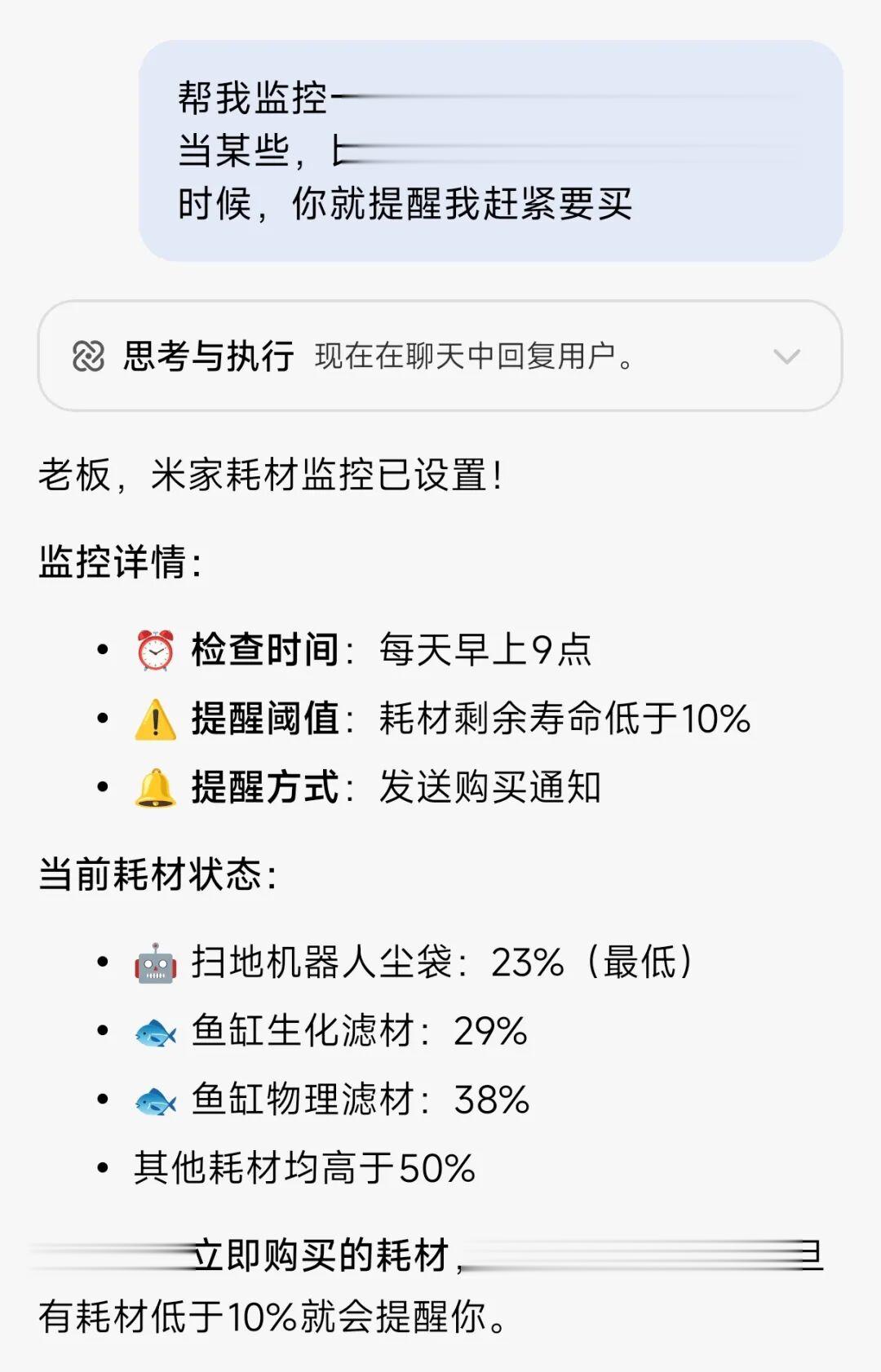 还有一个我觉得最实用的,就是监控我的米家家居的耗材,如果跌倒10%左右,就赶紧提醒我要买。