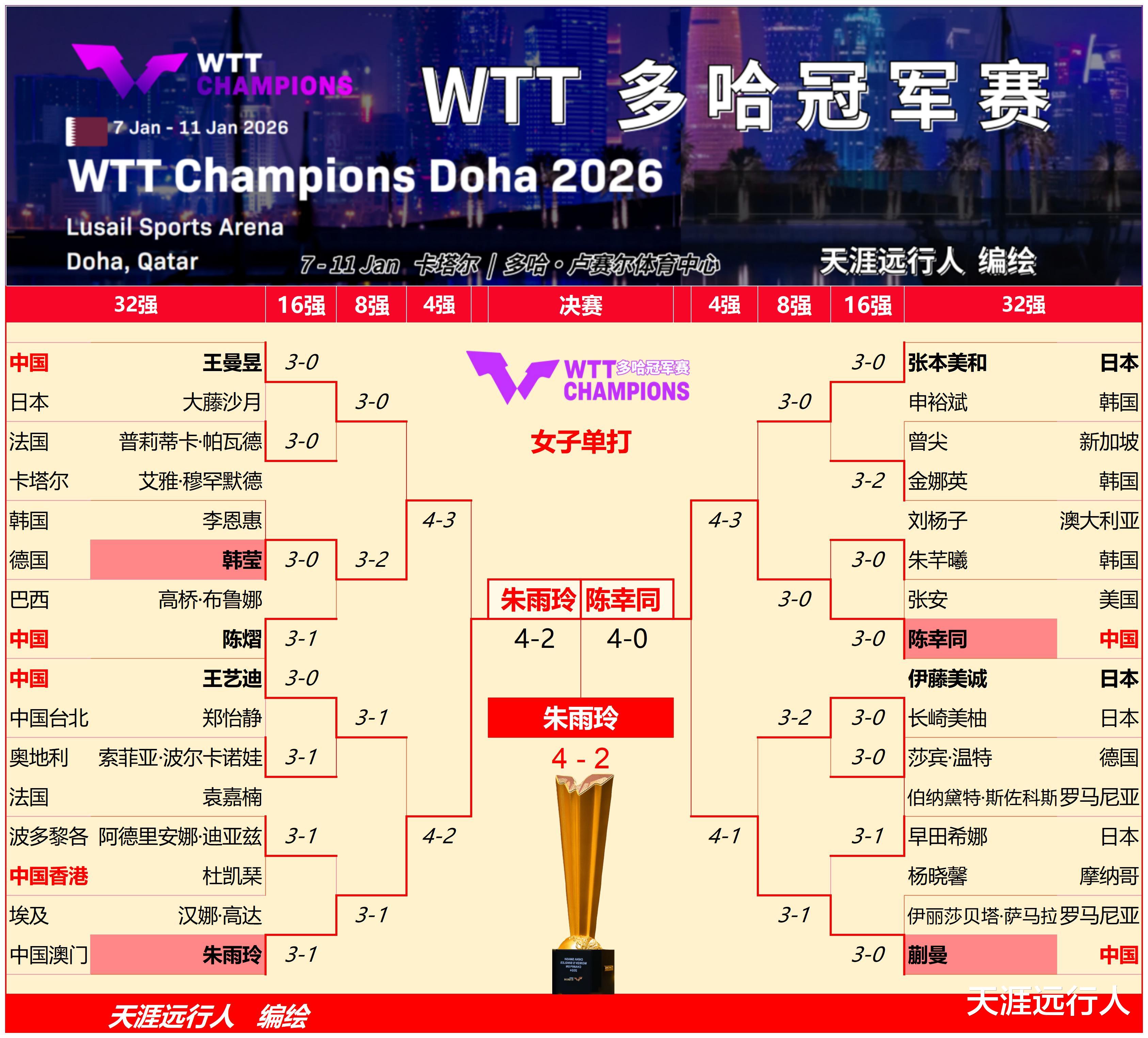 北京时间1月12日凌晨1时47分,2026世界乒联WTT冠军赛多哈站比赛的大幕落下,国乒军团无冠,2026年开年的第一项大赛,以一亚、两四强的战绩收官,差强人意。