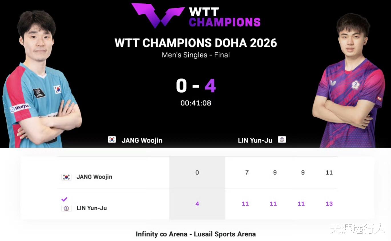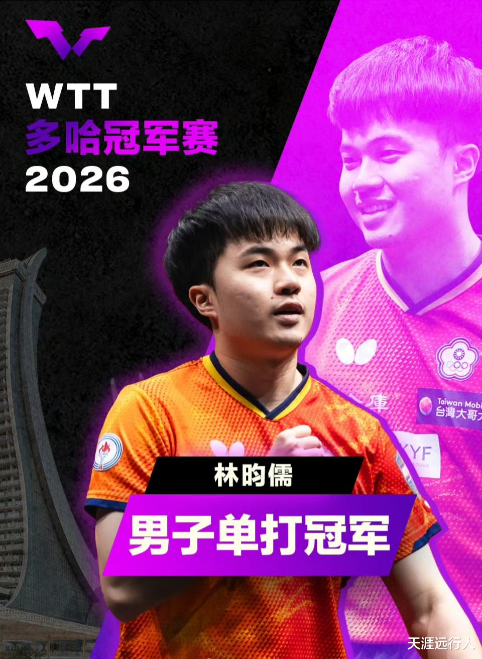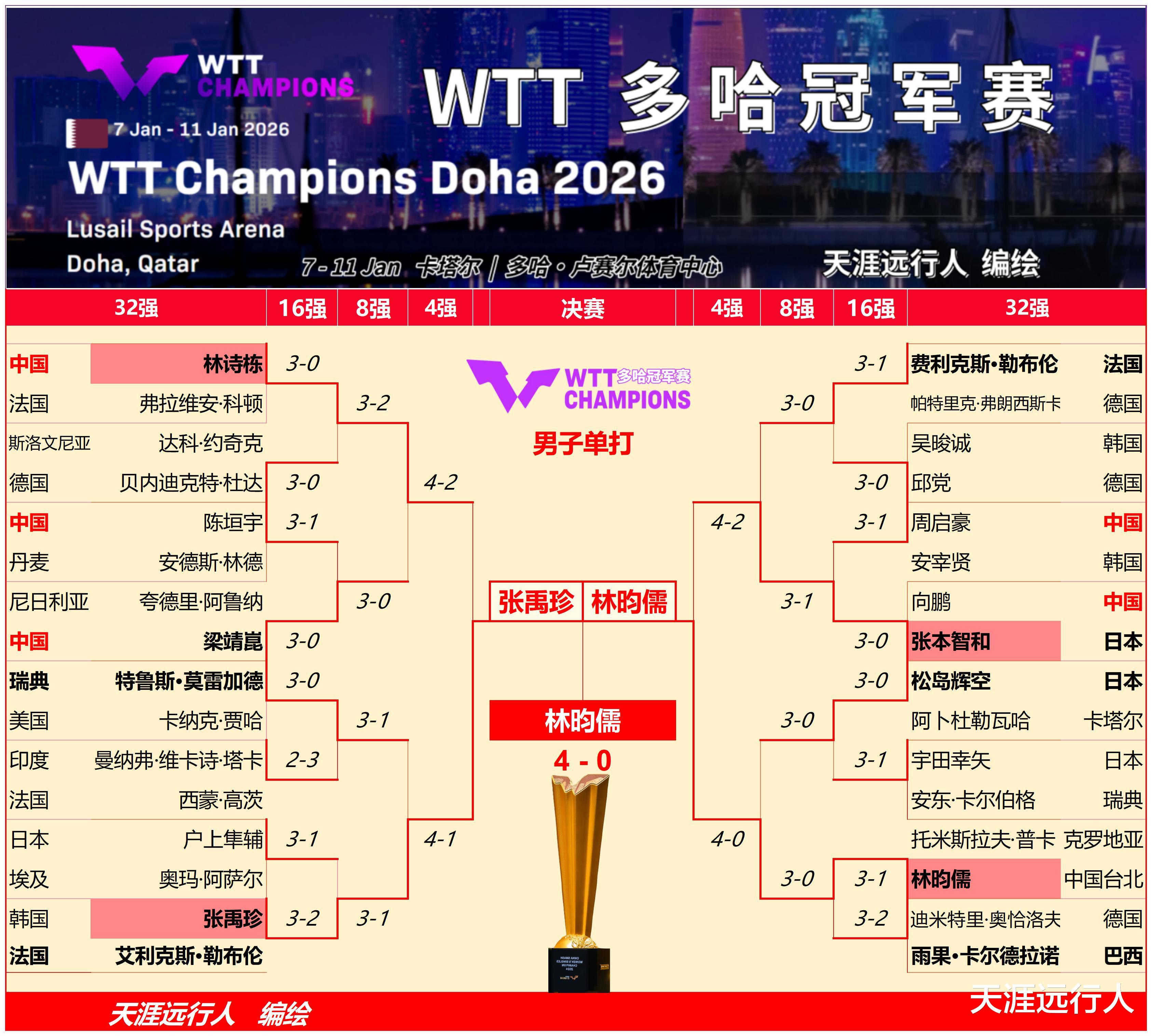 中国台北球员林昀儒,以4-0(11-7,11-9,11-9,13-11),力胜韩国球员张禹珍,林昀儒获得WTT冠军赛多哈站男单冠军,张禹珍获得亚军。
