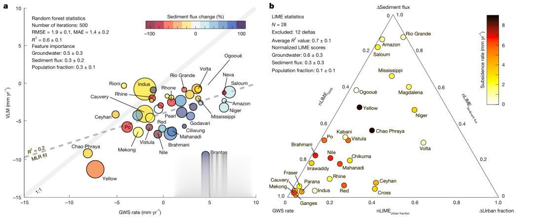 结果显示, 地下水储量变化是最主要的沉降驱动因素,在湄公河、恒河-布拉马普特拉河、莱茵河-默兹河、弗雷泽河等 35% 的三角洲中,地下水开采是导致沉降的首要原因。