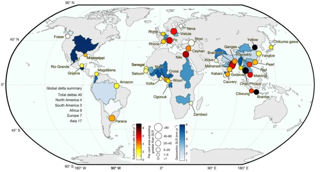 图 | 全球三角洲地表沉降分布图(来源:论文)