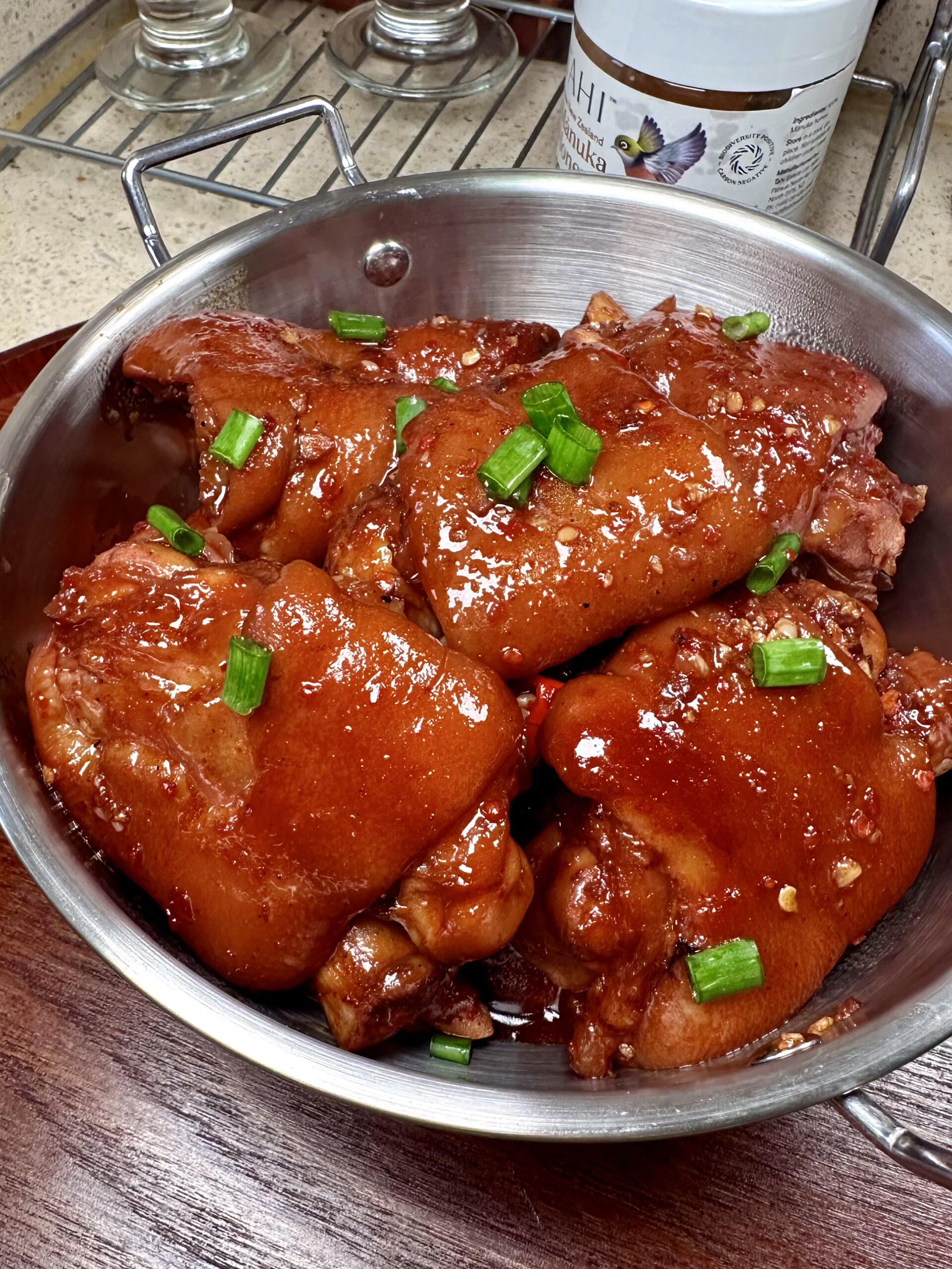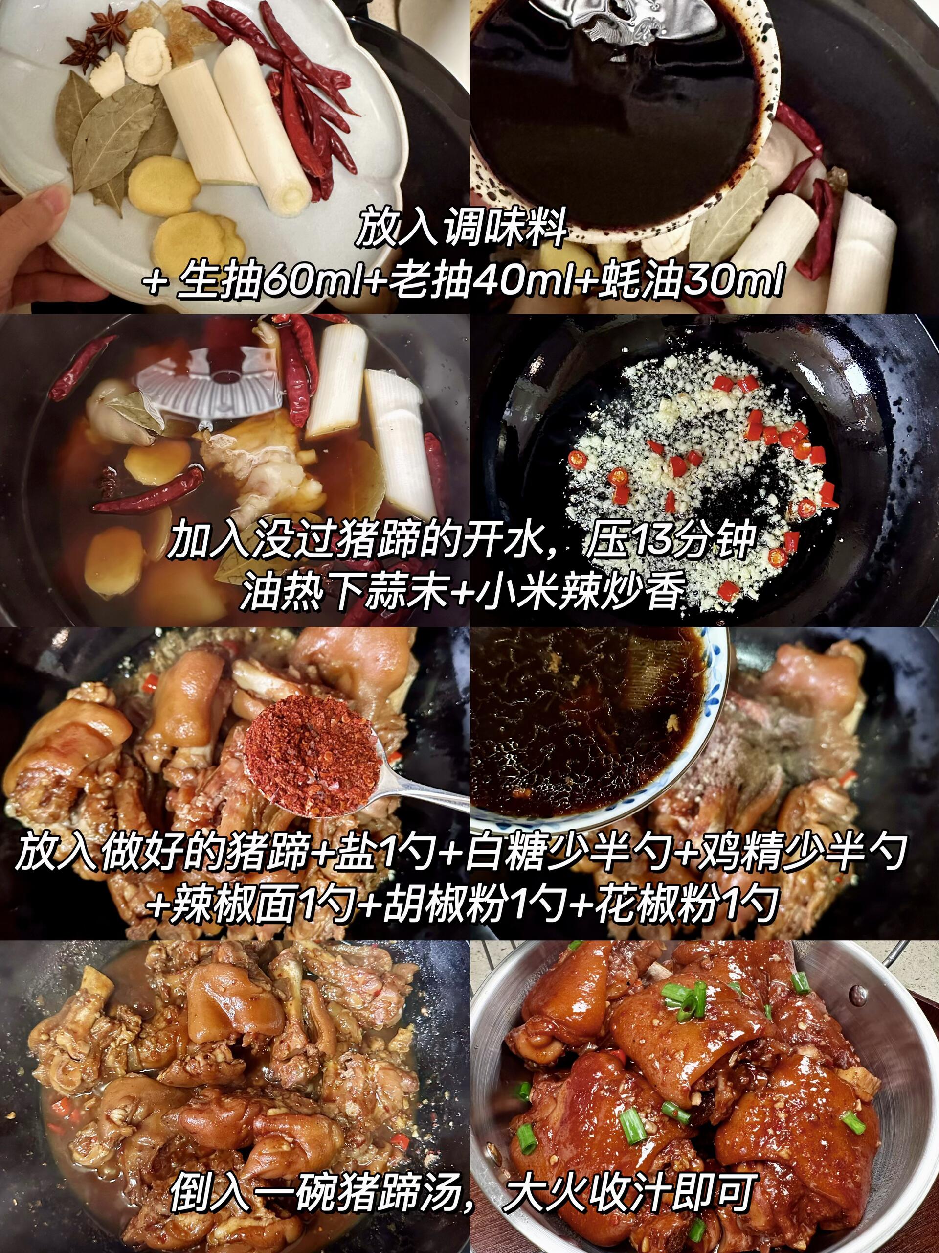 1. 把高压锅里的猪蹄和汤汁一起倒入炒锅(汤汁别全倒!留半碗后面用),开大火收汁。