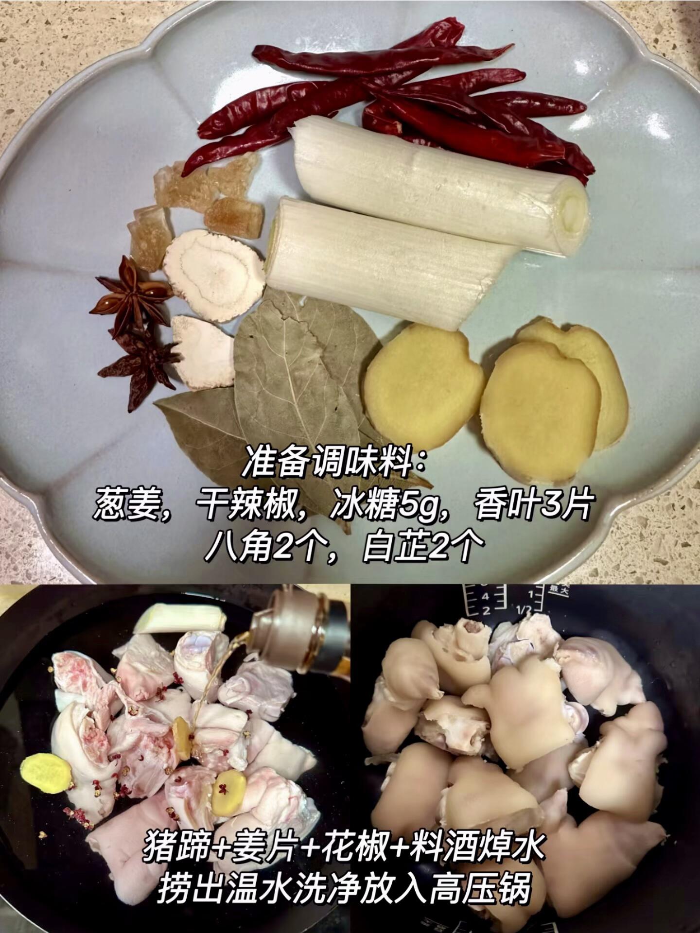1. 高压锅里放入焯好的猪蹄,加入香料包(干辣椒、冰糖、香叶、八角、白芷、葱段、剩余姜片)。