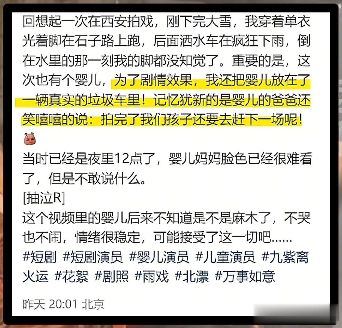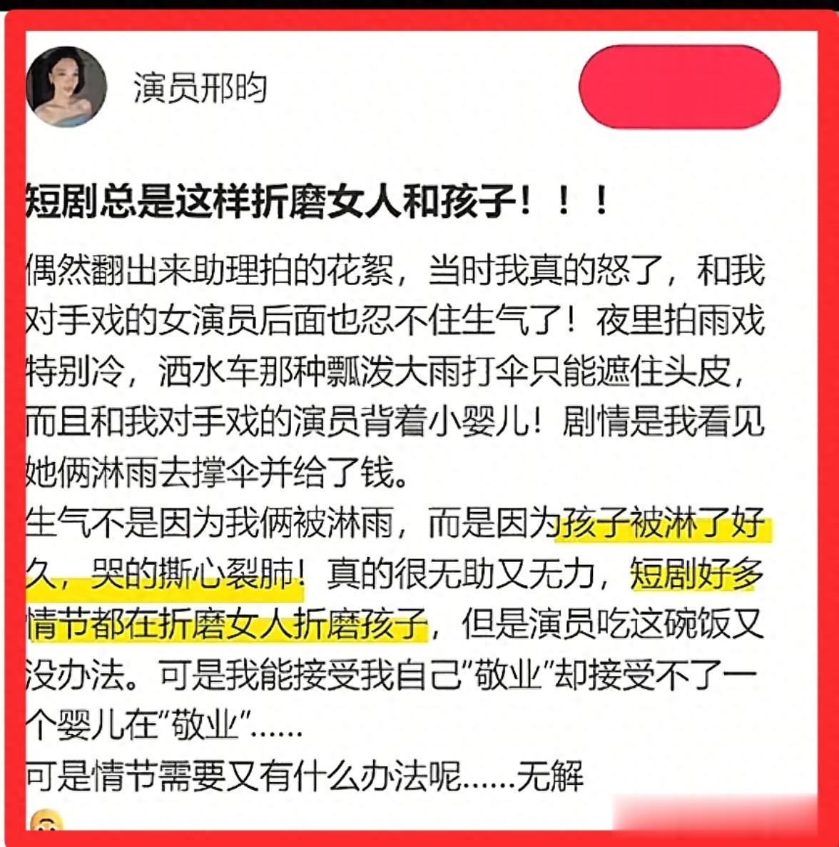 近日,短剧演员邢昀发文吐槽,剧组为了拍戏让婴儿一直淋雨,此事迅速冲上热搜,引发网友们的关注。