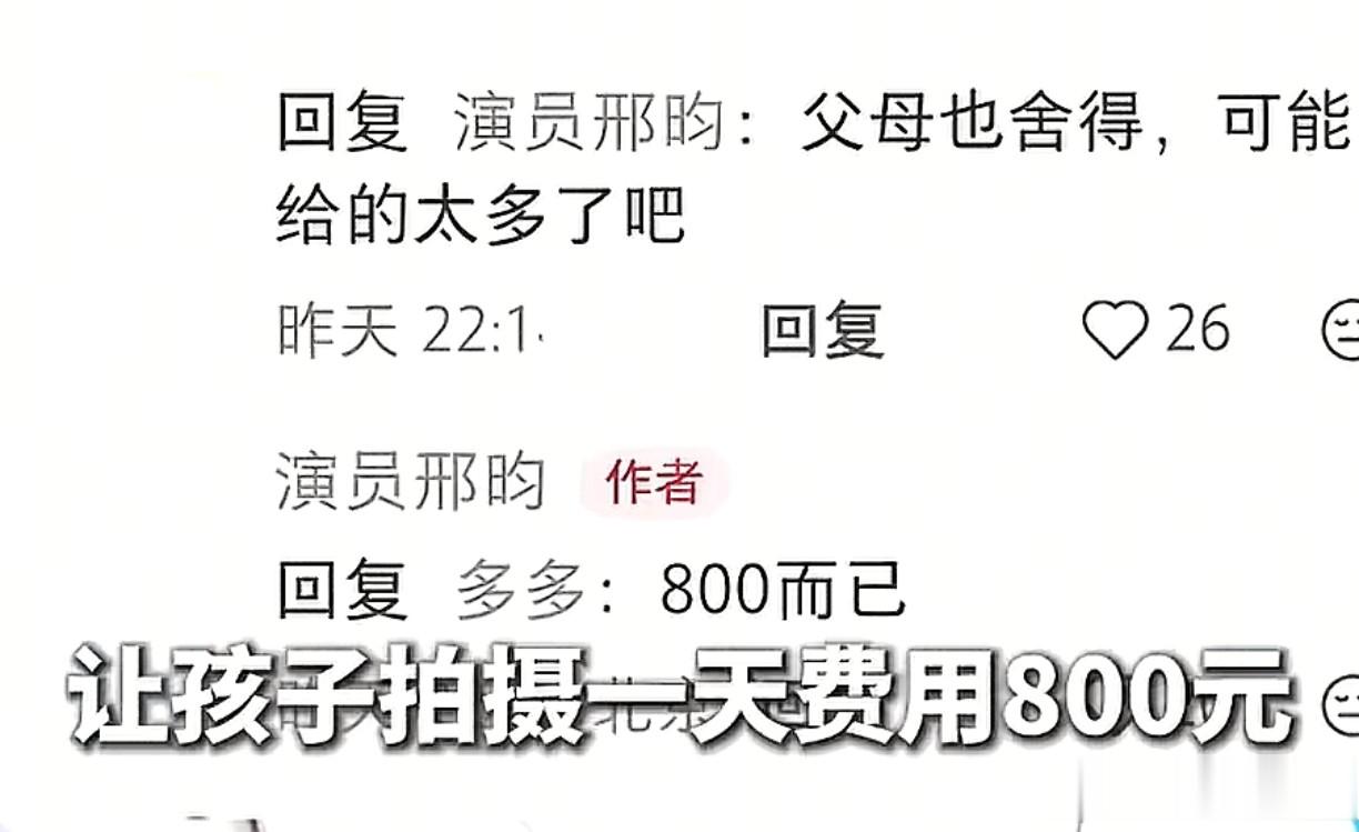 那么大人带着孩子演这个戏片酬是多少呢?邢均透露大概800元左右,很多家长因为经济的压力,只能默默的忍受着这一切。
