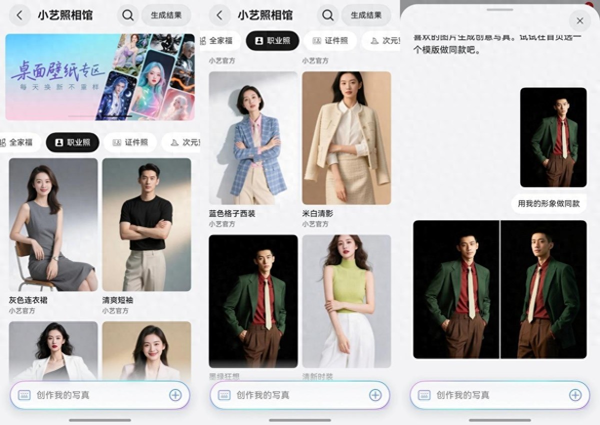 不妨用小艺照相馆,建立自己的“职业形象库”。上传一张清晰的正面生活照,选择“职业照”模板,以及需要的风格,一分钟内,一张光影自然、神态自信的职业照就生成了。不同岗位配不同形象照,投递成功率这不得直接往上走。