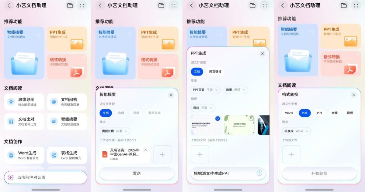 同样,要是手头有一份研究报告或方案文档,需要转成PPT文稿汇报,把文件交给小艺文档助理,选好页数、场景和风格,TA直接生成一份结构完整的PPT。此外,格式转换也不用再找其他工具,小艺文档助理可以实现PDF、Word、PPT、音视频等多种格式之间的灵活互转。