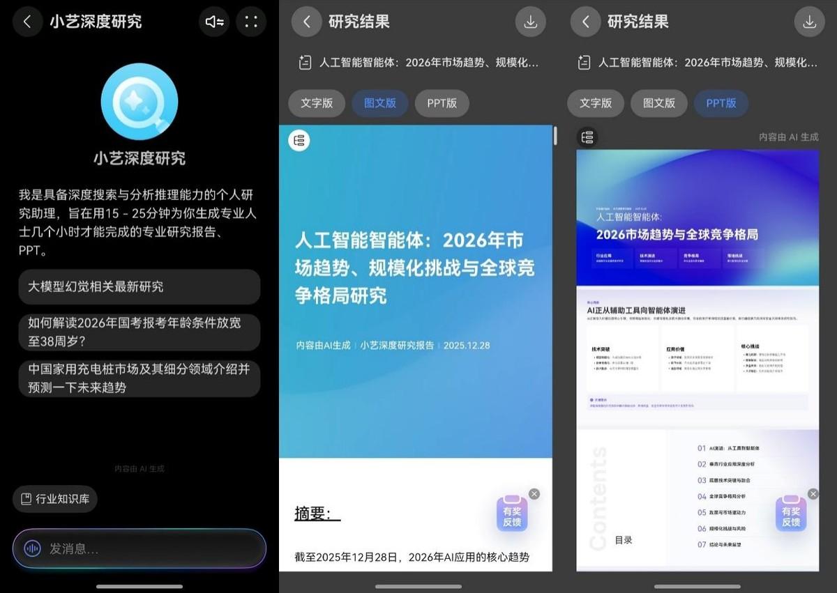 现在,这个过程可以交给小艺深度研究。直接告诉TA需求,小艺会自动拆解任务,从全网搜索数千个信源,结合权威知识库进行深度推理,最后输出一份逻辑清晰、有数据支撑的研究报告,还能直接导出PPT格式。而且,用手机就能跑,不需要坐在电脑前。通勤路上下达指令,到公司之后报告初稿已经在手边了。
