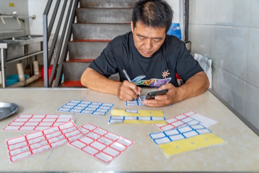 有些医院的医生和幼儿园老师不想吃食堂了,都来他们家订餐,10点钟菜全部上齐了。男老板手写外卖单,海燕和小工则进入疯狂打餐模式。打完一个单位的就赶紧送一个单位。