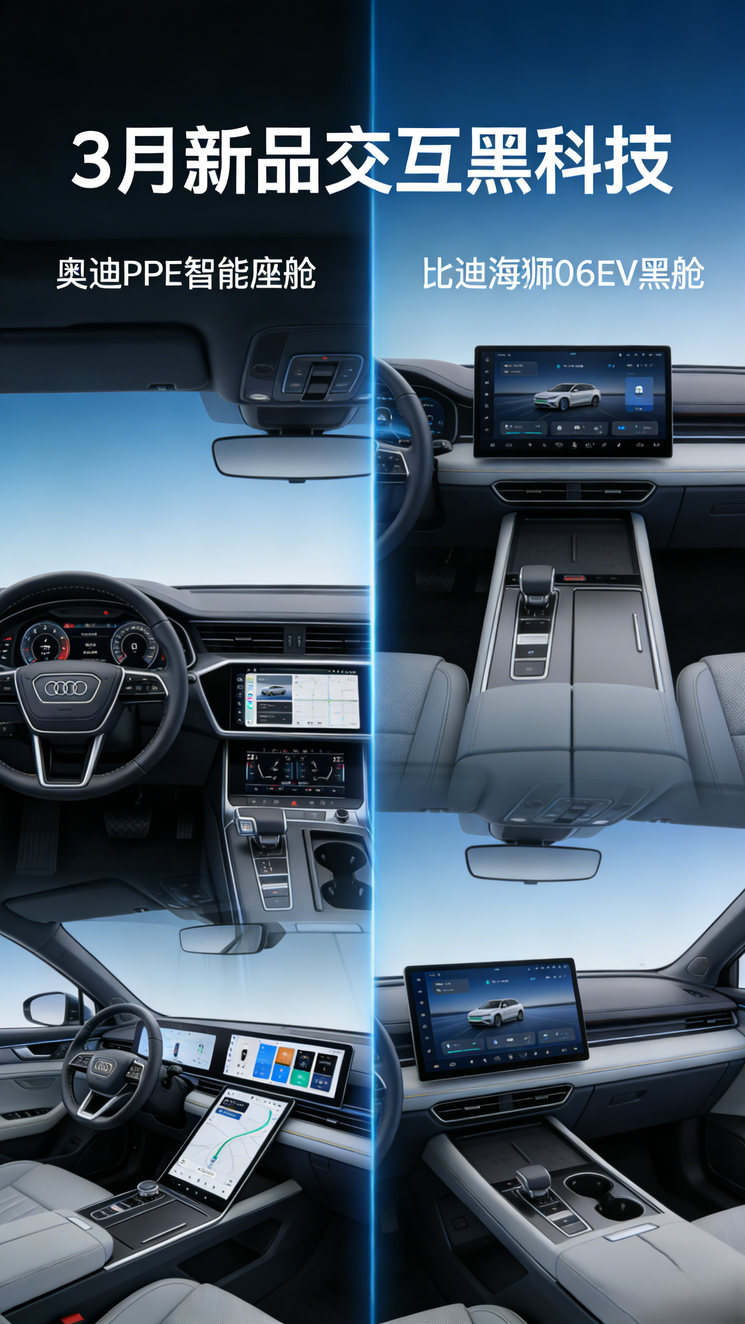 从车企官方发布的技术参数来看,此次全新智能交互系统的核心优势体现在“快速响应”“全场景适配”与“便捷操作”三个维度,所有技术细节均有明确披露,数据来源真实可靠,让读者放心了解。奥迪全新PPE智能座舱搭载高阶车机芯片(保障系统流畅运行,避免卡顿),配备10.9英寸主驾显示屏与副驾娱乐屏组成的5屏智能联动系统,搭配AR-HUD增强现实抬头显示功能(可将导航、车速等核心信息投射到前挡风玻璃,不用低头查看),可将核心驾驶信息投射至前挡风玻璃,无需低头即可查看,有效规避驾驶分心风险,保障出行安全。比亚迪海狮06 EV搭载智能座舱高阶版-DiLink 100,配备曲面OLED屏与AR-HUD多屏联动系统,支持ONE ID个性化设置(登录一个账号即可同步所有个人习惯设置,无需重复调节),实现定制化交互体验,贴合不同车主的使用习惯。两款车型均搭载0.2秒瞬时响应的全场景语音助手,支持连续对话、多指令联动与眼神+语言组合控制(看一眼屏幕+说指令即可操作),零层级UI设计(常用功能直接显示在主屏幕,不用多级点击)搭配AI智能推荐功能,大幅简化操作流程,从根源上解决驾驶分心问题,让交互更便捷、更安全。