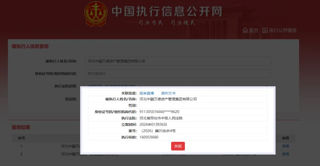 中国执行信息公开网信息,2026年1月6日,邢台市中级人民法院将河北中融集团列为被执行人,被执行金额1.6亿元,案号为(2026)冀05执恢4号。