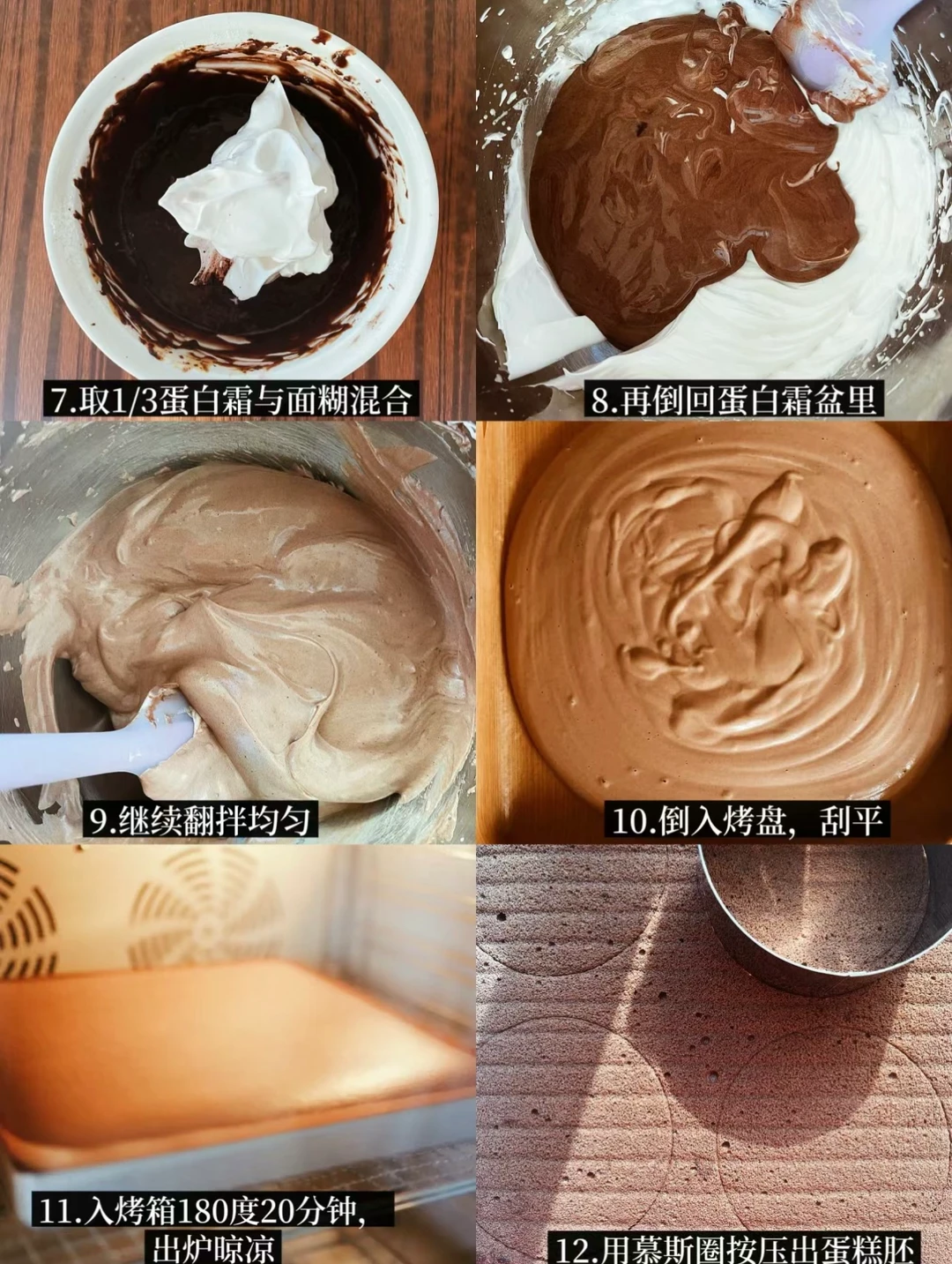 4️⃣放入预热好的烤箱,180度烤20分钟,出炉震模,倒扣晾凉以后,用慕斯圈压出4片蛋糕胚。一个蛋糕需要2片