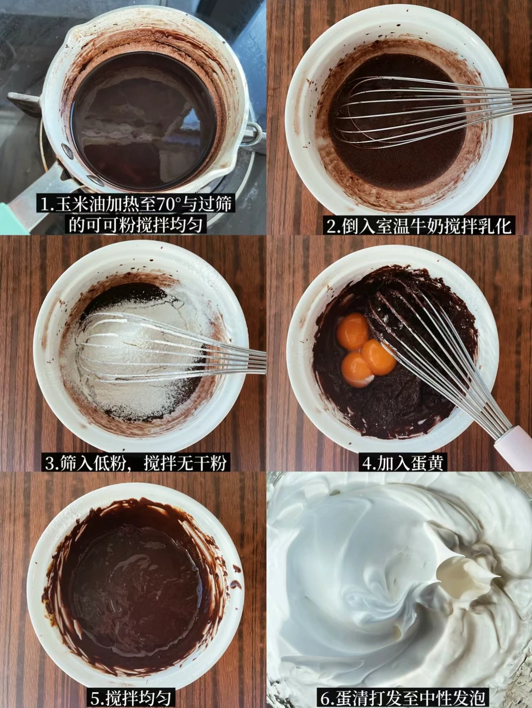 1️⃣ 加热玉米油至70度,倒入提前过筛的可可粉,快速搅拌溶化,倒入室温牛奶,搅拌乳化,没有一点油星为止