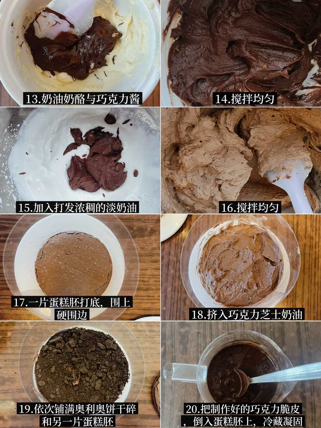 6️⃣一片蛋糕胚打底,围上硬围边,依次挤入巧克力芝士奶油、铺满奥利奥饼干碎、再放上一片蛋糕胚。