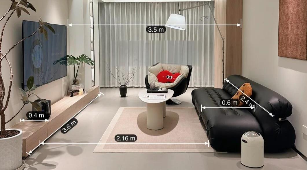 ▲适配场景:适合客厅开间3.5米以上的家庭,最佳观影距离3.2-4.5米,不管是大平层、常规三居室,还是现代简约、轻奢风家居,都能无缝适配,不会显得突兀。