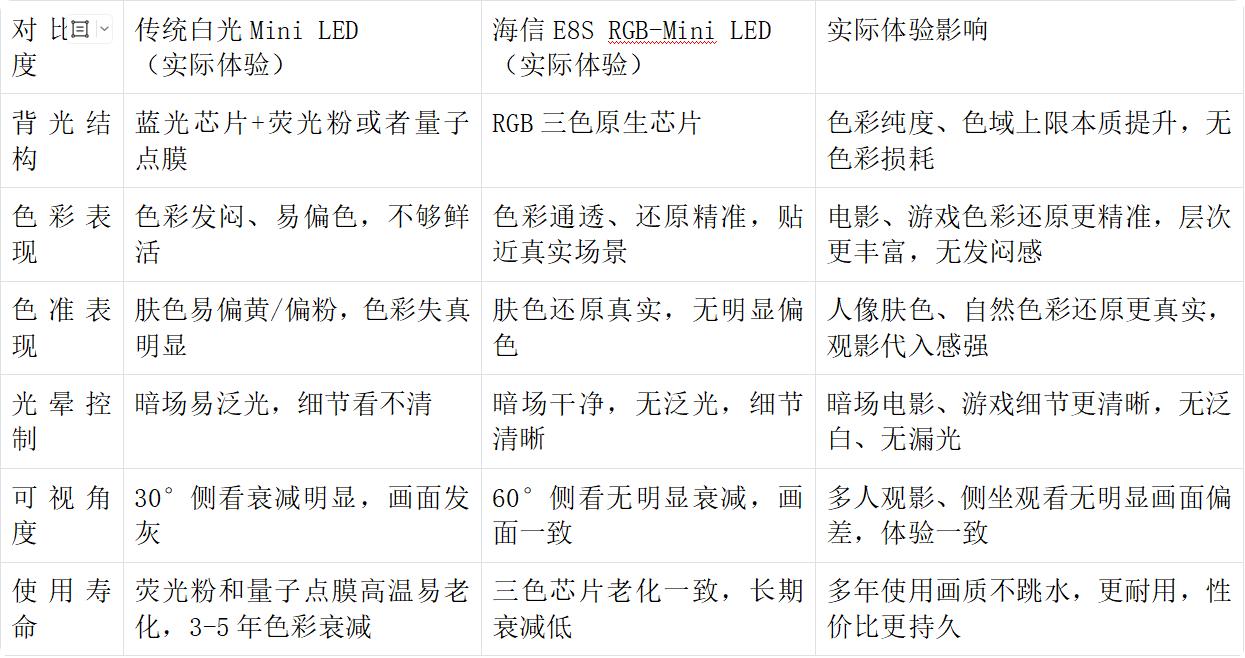 二、核心技术解析:RGB-Mini LED VS 传统量子点Mini LED,差别到底在哪?很多人买电视,会被“Mini LED”概念搞晕,分不清RGB和普通单色光Mini LED的区别,甚至被商家忽悠。这一部分,我用通俗的语言+真实体验,帮大家讲透,不管买不买海信E8S,都能学会怎么区分。