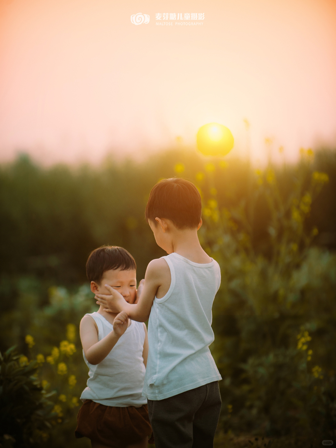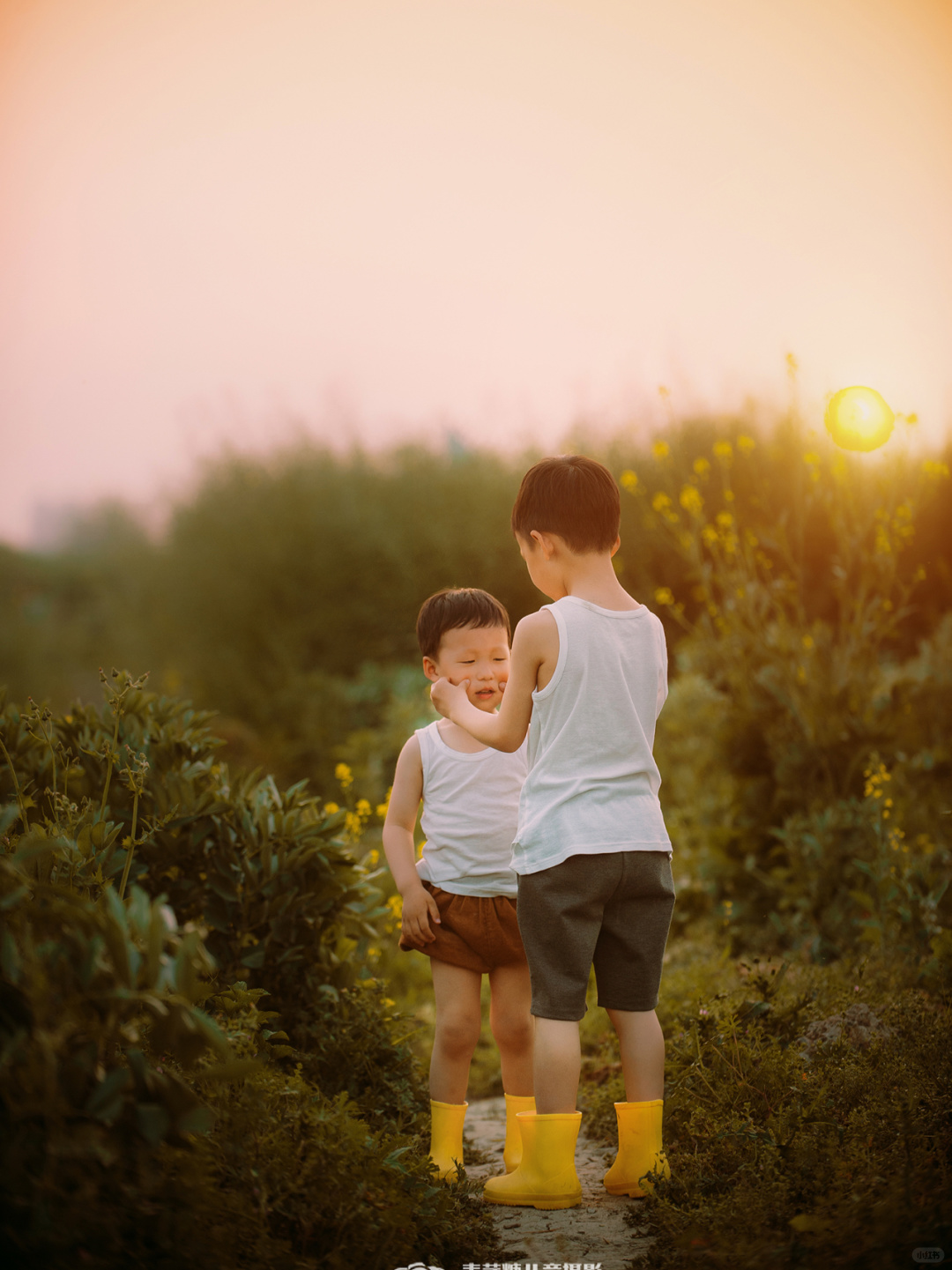 田间地头的童年 傍晚的田间 到处能听到青蛙🐸和蛐蛐儿叫声 远处布谷鸟也在不停地叫着 最让人动容的是这样的画面中 还有你们兄弟俩的笑声 📷:麦芽糖儿童摄影