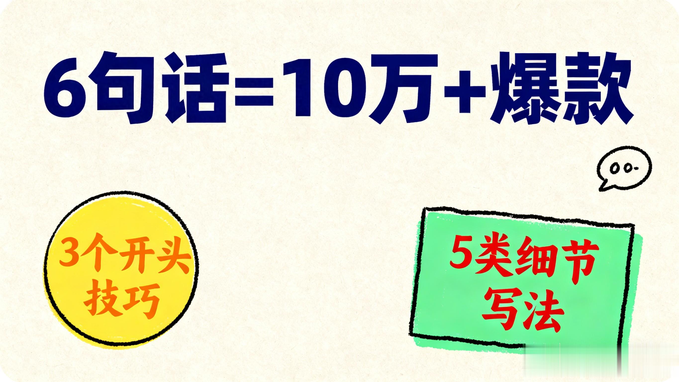 其实写爆款文没那么难,不用死磕文笔,也不用等“灵感降临”。把这6句话记在心里,写每篇文章前先对照着想:开头有没有抓眼球?有没有多提“你”?故事有没有细节?痛点和解药够不够明确?标题带没带数字?结尾有没有留互动?坚持用下来,你会发现,流量慢慢就来了,甚至能写出自己的第一篇10万的爆款文案。