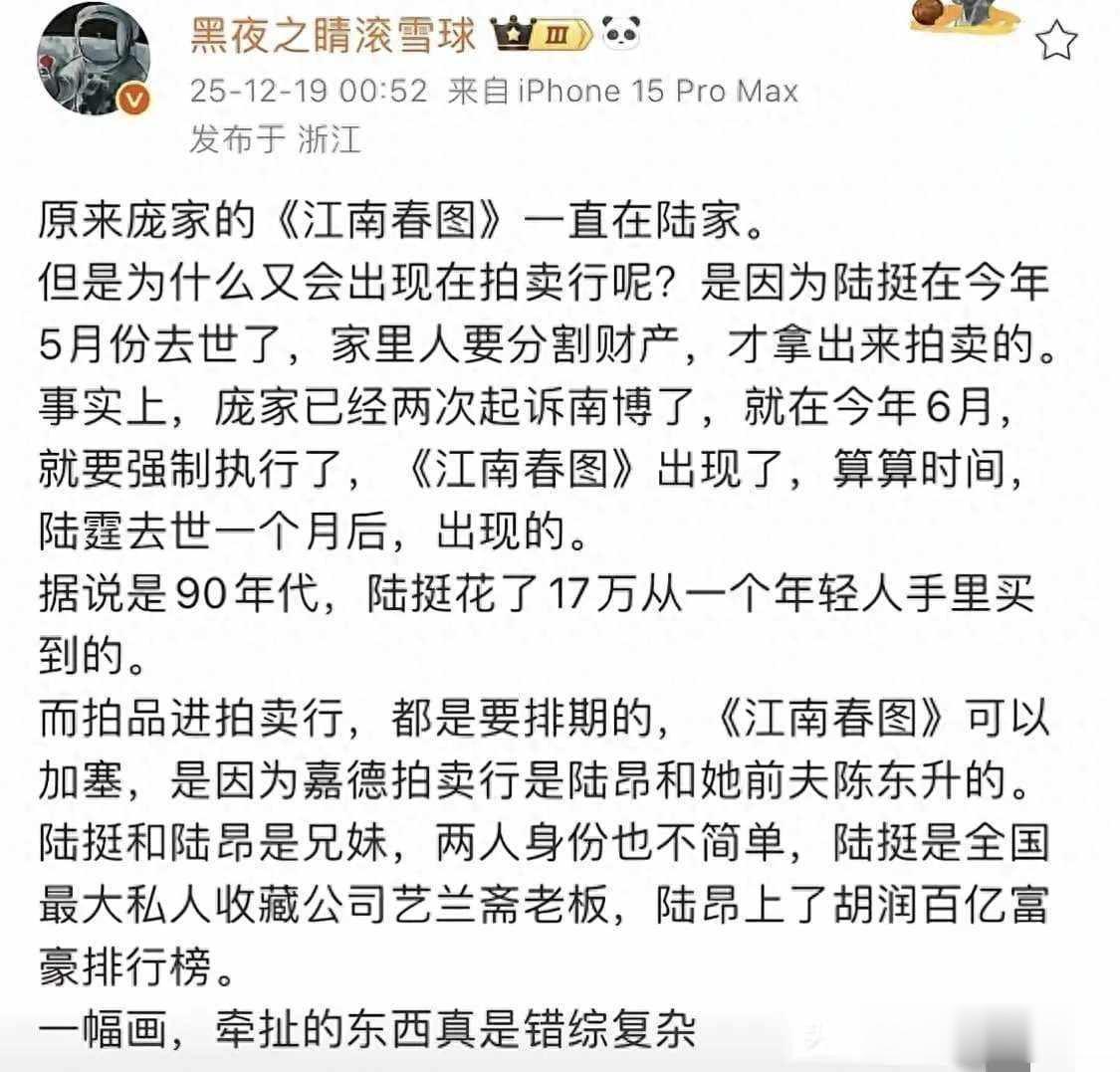 2025年5月陆挺去世后,家人在整理他的遗物时发现,这幅画竟然出现在北京的一家拍卖行里,估价达到八千八百万,庞家人赶紧出面阻止,否则就真的被拍卖出去了,现在双方说法不一致,一方说是在2001年卖掉的,另一方却说在90年代就已经拥有它,到底是不是同一幅画,这件事谁也说不清楚。
