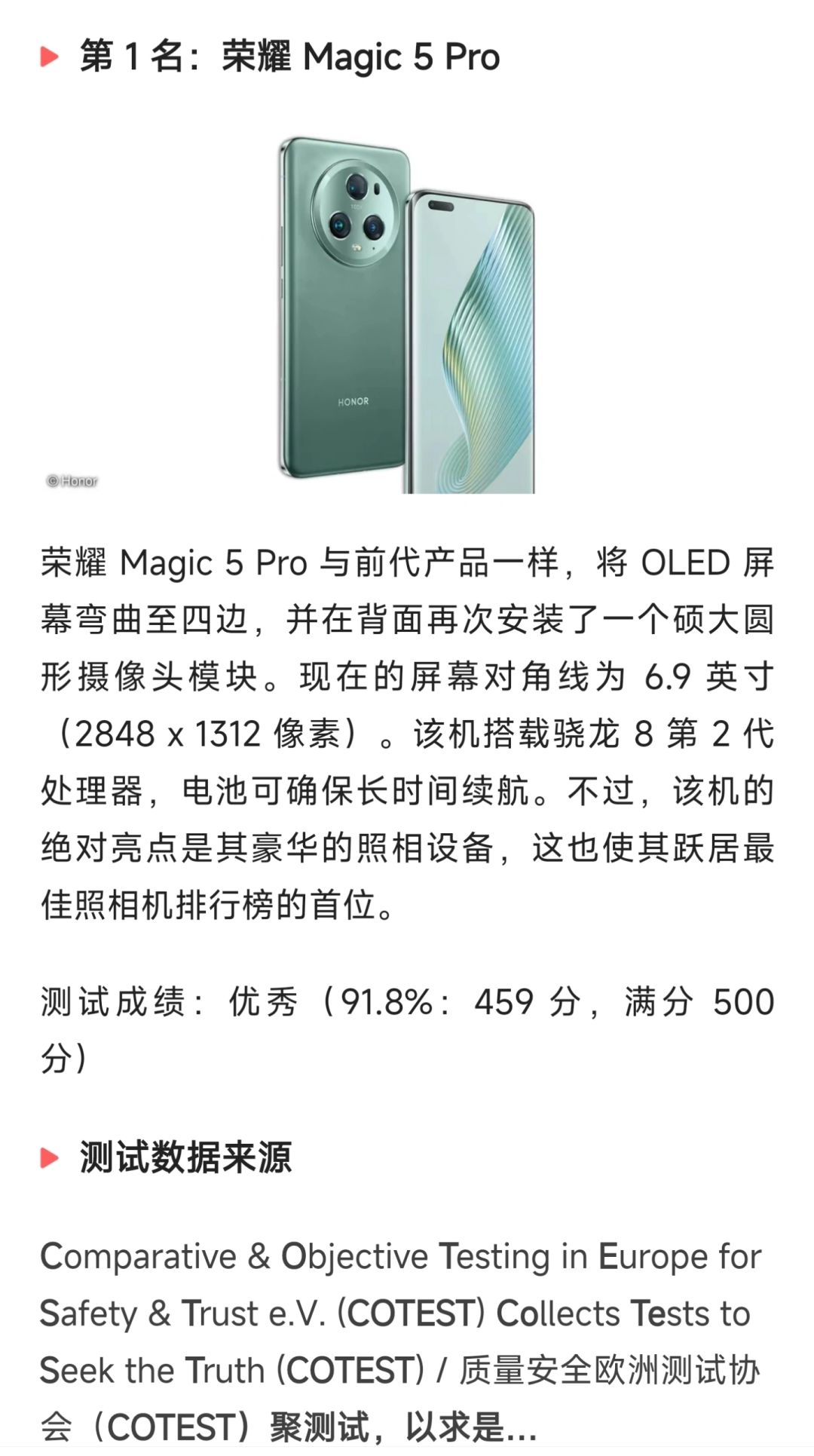 第 1 名:荣耀 Magic 5 Pro,评分459