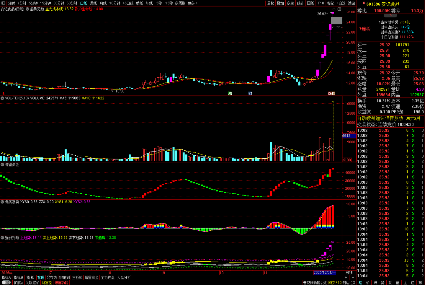 技术分析:安记食品昨日中阳线上涨9.99%,股价处于上行趋势,并且加速拉升,成交金额较昨日增加1597.39%。日线拉出长下影线,短期均线组合多头排列,MACD红柱连续多日放大,MACD各项指标处于上升趋势,KDJ处于超买区。